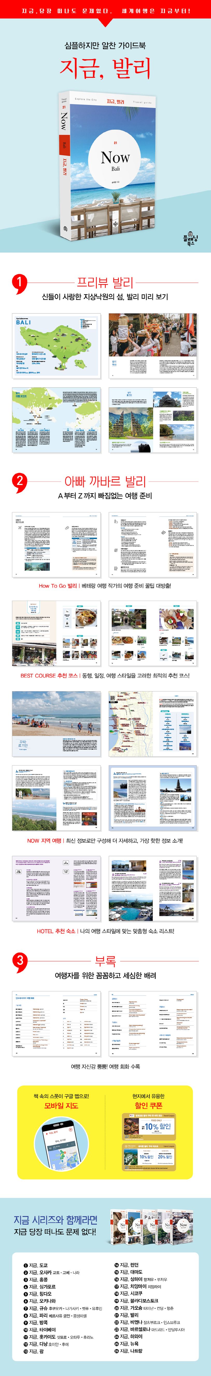 〈지금, 발리〉는 떠오르는 핫 플레이스부터 숨겨진 명소까지 발리의 모든 것을 담으려 노력했다. 휴양지답게 고급스러운 풀빌라 소개부터 서버들이 사랑하는 해변을 초급부터 자격증 코스까지 제시하고 있으며, 여행 하면 빠질 수 없는 맛집도 발리의 분위기를 듬뿍 담은 곳부터 발리 아닌 발리 같은 이색적인 곳까지 다양한 선택할 수 있게 소개하고 있다. 발리 여행에 최적화된 〈지금, 발리〉로 색다른 발리 여행을 떠나 보자!