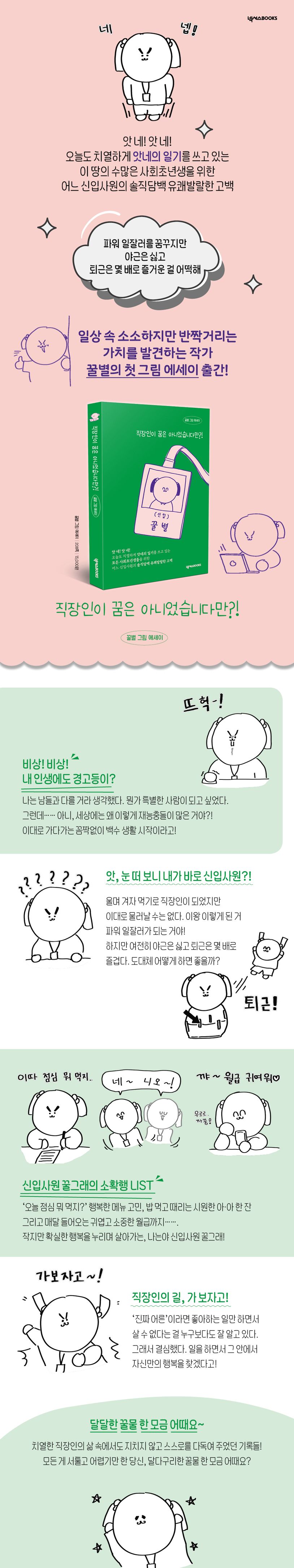 돈을 벌기 위해 울며 겨자 먹기로 신입사원이 되었지만 이대로 물러날 수는 없다. 하루의 반 이상을 보내는 사무실에서 그저 시간을 죽일 수는 없는 노릇이다. ‘파워 일잘러’를 꿈꾸며 그렇게 직장인으로서 첫 발걸음을 내디딘 꿀별. 하지만 여전히 야근은 싫고 퇴근은 몇 배로 즐겁다. 도대체 어떻게 하면 좋을까?