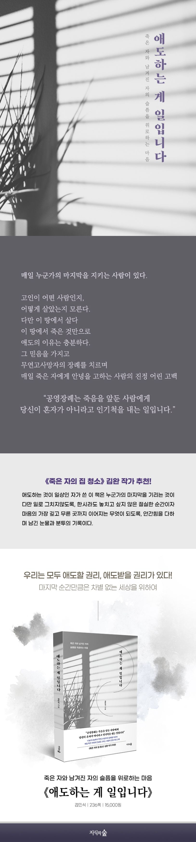 이 책은 ‘애도하는 것’이 ‘일’인 사람, 나눔과나눔에서 무연고사망자의 장례를 치르며 애도조차 쉽지 않음을 절감하고 그 권리를 되찾아 주기 위해 부단히 애쓰는 한 사람이 적어 내려간 분투의 기록이다. 더는 애도의 권리를 박탈당하는 일이 없길 바라면서, 더는 생의 마지막 순간만큼은 차별이 없기를 바라면서.