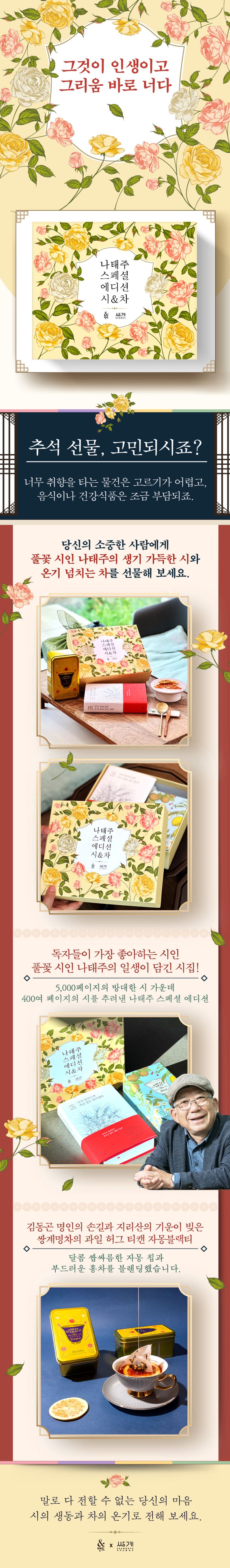 서정시의 새로운 경지를 선보이며 뒤늦은 나이임에도 보기 드문 전성기를 누리고 있는 시력(詩歷) 50년 차의 시인 나태주. 풀꽃 시인 나태주와 지리산의 생기를 차의 온기로 담아내는 쌍계명차가 “나태주의 스페셜 에디션 시&차”를 통해 만났다.