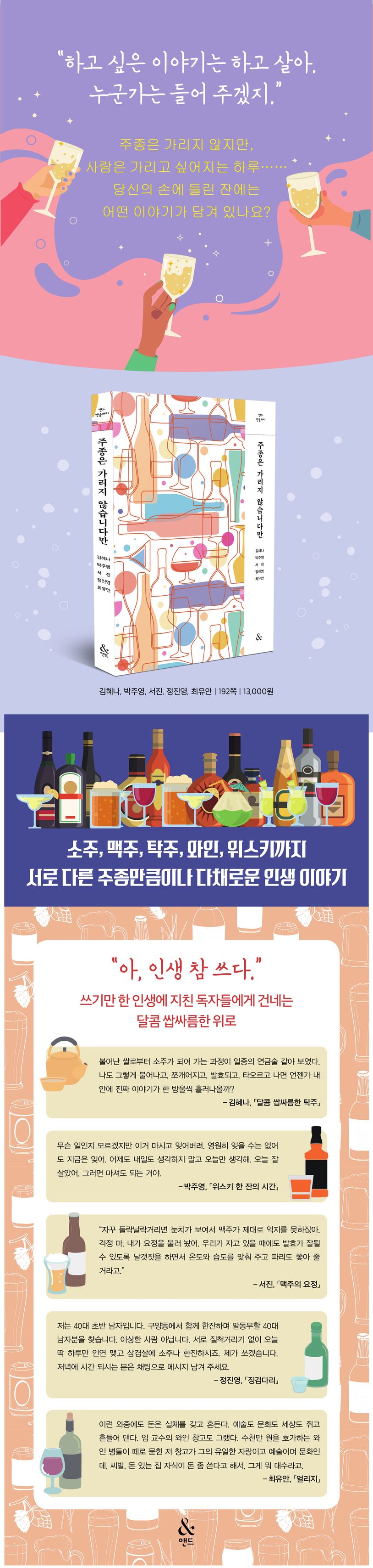 소주, 맥주, 탁주, 와인, 위스키까지. 서로 다른 주종만큼이나 다채로운 인생 이야기를 담은 이번 앤솔러지는 쓰기만 한 인생에 지친 독자들에게 달콤 쌉싸름한 위로를 건넨다.