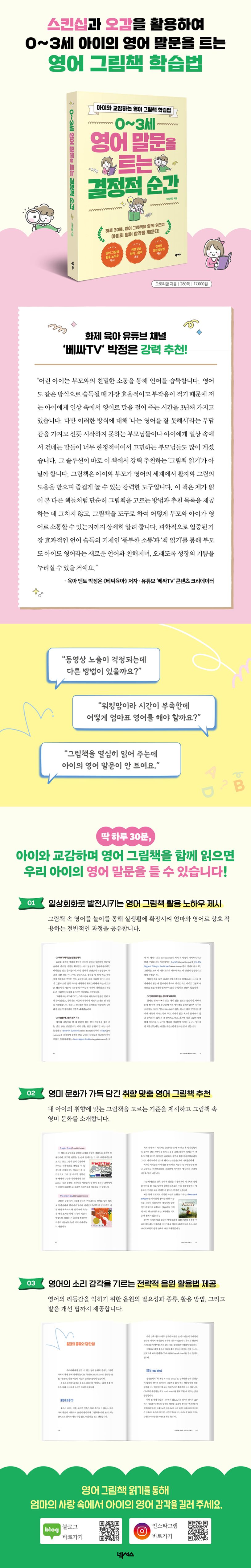 바쁜 워킹맘이라도 하루에 딱 30분만 오감을 활용하여 영어 그림책을 읽으면 일방적인 영어가 아닌, 상대방과 상호 작용하는 영어 대화가 가능해진다. 우리 아이의 영어 발화 감각이 결정되는, 아주 강력한 방법인 ‘영어 그림책 읽기’. 그 모든 실제 경험과 구체적인 노하우를 공유한다.