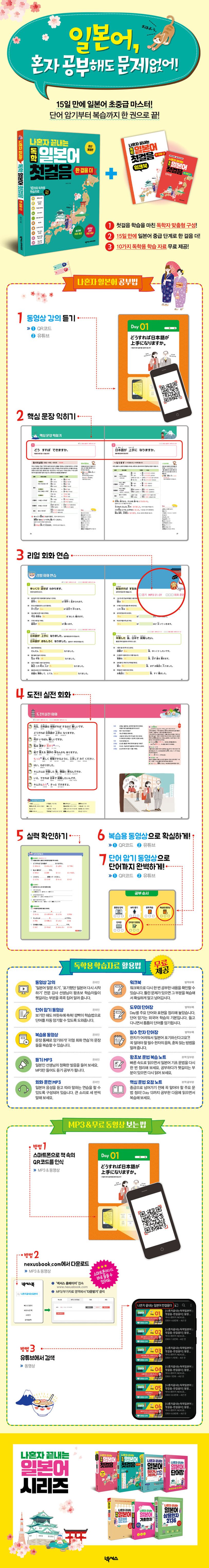 〈나혼자 끝내는 독학 일본어 첫걸음-한 걸음 더〉는 히라가나부터 시작하는 〈나혼자 끝내는 독학 일본어 첫걸음〉 책 한 권을 마친 학습자들이 중급 단계로 넘어가기 위해 보는 책입니다. 입문 단계 학습을 끝낸 뒤 곧바로 JLPT N3을 준비하거나 실전 회화 공부로 넘어가기에는 다소 어려움이 있습니다. 따라서 일본어 중급 단계를 마스터하기 위해서는 문법과 어휘를 보강해 주어야 합니다.