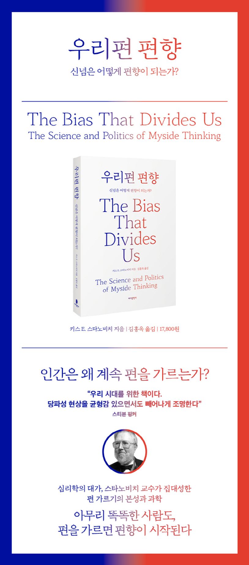 ‘내 편 네 편’ ‘우리와 그들’을 가르는 편 가르기는 왜 인간의 삶에서 계속되는가? 합리성과 편향을 오래 연구해 온, 과학적 심리학의 대가, 스타노비치 교수는 오직 ‘우리편’만을 우호적으로 해석하고, 그 결점에 관대한 인간의 경향, 우리편 편향Myside Bias에 주목한다. 집단 정체성으로 귀결되는 이 편향의 저변에는 신념과 확신에 찬 세계관이 존재한다. 관점을 바꿔 보는 능력을 결여한 채 제 논에 물 대기 식으로 상황을 해석하고, 팔이 안으로 굽는 식으로 애써 진실을 외면하는 우리의 본성은 스스로의 꾸준한 노력 없이는 개선될 수 없다.