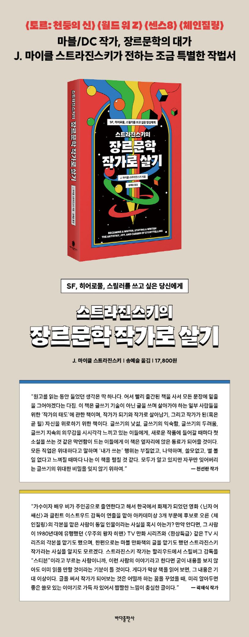 거기에더불어저자인스트라진스키가각본과제작에참여했던작품들을탄생과정을보는것도쏠쏠한재미를준다.마블유니버스의‘토르’캐릭터가만화에서영화로부활하게된계기와영화속아스가르드의탄생속비하인드,《슈퍼맨:어스원》에서슈퍼맨탄생배경에대한새로운서사를넣게된과정,스파이더맨시리즈속에서멀티버스의모토가된《어메이징스파이더맨》이야기등저자의작품이탄생하게된과정을따라가다보면,장르문학과영화를사랑하는독자들뿐만아니라글쓰는삶을살아가는모든사람들에게재미와감동을줄것이다.