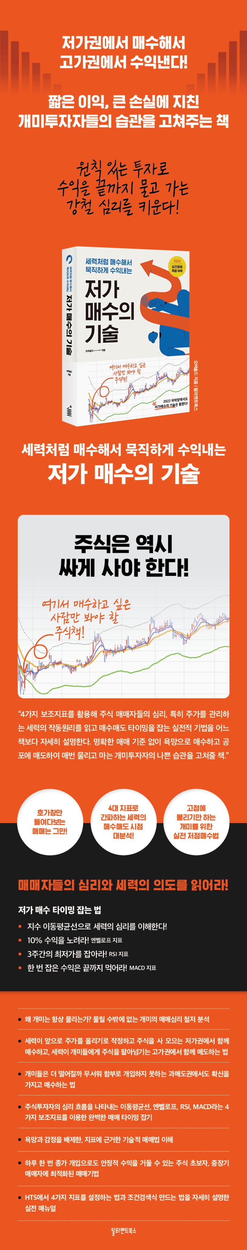 2021년 출간되어 독자들의 꾸준한 사랑을 받았던 《세력처럼 매수해서 묵직하게 수익내는 저가 매수의 기술》 개정판이 새로 출간됐다. 이번 개정판은 본서의 ‘저가 매수의 기술’이 모두가 힘들어 한 2022년의 하락장에서도 어떻게 성과를 냈는지를, 특별 부록 ‘2022년 실전 부록 - 하락장에서도 저가 매수의 기술은 통했다’에 특별히 새로 추가했다.
