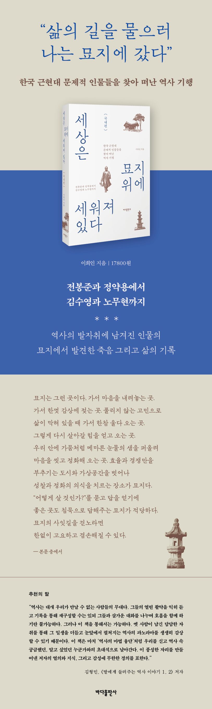 “묘지”라는 키워드로 여행 인문학의 새로운 시각을 제시한 작가 이희인이 우리나라 근현대 인물들의 묘지를 답사하며 정치와 문화의 역사를 살핀다. 2019년 《세상은 묘지 위에 세워져 있다》(해외편)을 통해 ‘인문학 여행 에세이’의 새로운 방법론을 제시한 저자는 우리나라 곳곳의 묘지를 돌아보며 근대 이후 우리 역사에 이름을 남긴 유명인들의 죽음과 삶을, 그리고 그들이 남긴 흔적을 정리한다.