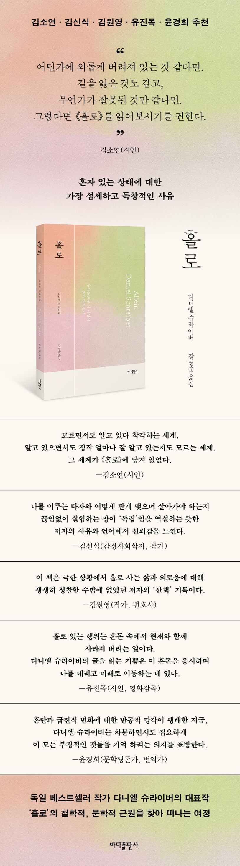 그저 혼자 있을 뿐인데 주변에서 자꾸 이유를 묻는다. 이유 같은 건 없다. 문제 같은 건 더더군다나 없다. 문제가 있다 하더라도 그건 이 세상에 태어난 인간이라면 모두가 가지고 있는 주춤거림과 외로움, 두려움이다. 마찬가지로 즐거움과 회복, 계속 나아감도 있다. 이러한 감정들은 혼자 있는 데 이유가 되지는 않는다. 저자 다니엘 슈라이버의 말대로 ‘우리가 혼자 있는 이유는 우리가 혼자 있고 싶어 했기 때문’일 것이다.