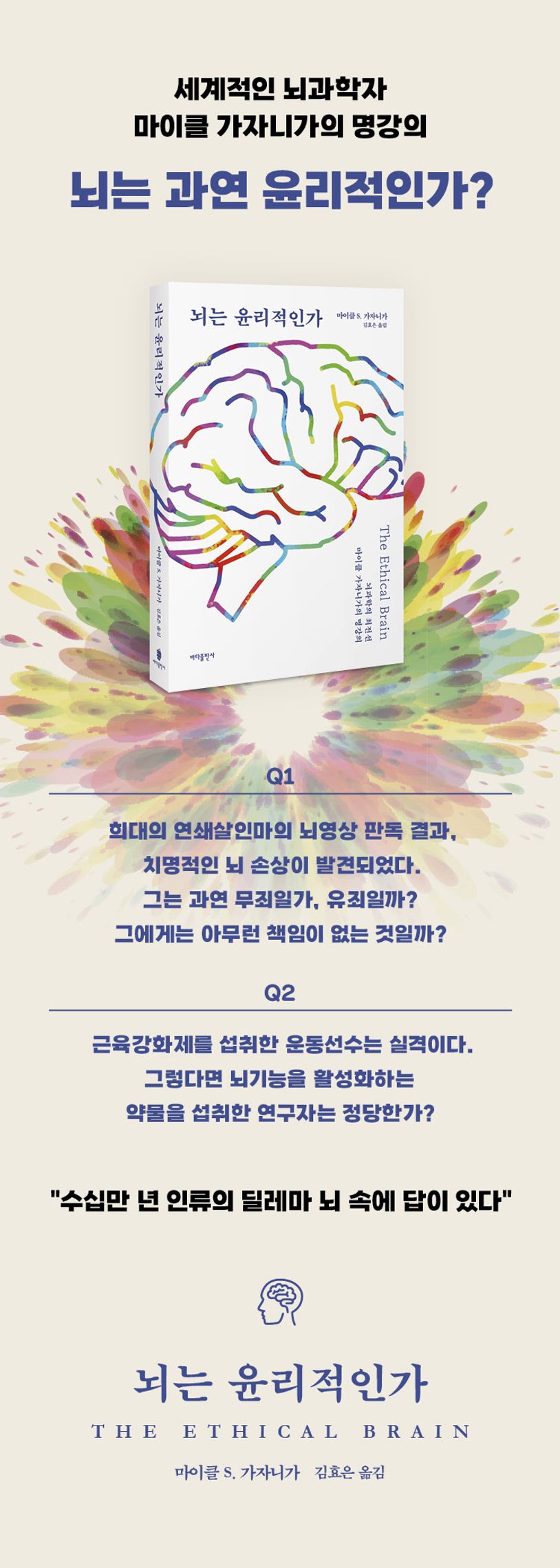 이 책 《뇌는 윤리적인가》는 마이클 가자니가의 대표 저작으로, 신경과학 연구자들뿐 아니라 철학자, 정치인, 사회학자들에게도 필독서로 자리매김한 책이다. 기존의 수많은 뇌과학 관련 책들이 대부분 뇌의 구조나 메커니즘을 밝히는 데 집중한 반면, 이 책은 이처럼 발전한 뇌과학 기술이 사회적으로 어떤 의미를 지닐 수 있는지를 탐구한 최초의 책이라고 할 수 있다. 특히 뇌와 관련한 ‘기묘한 이야기’ 내지는 ‘뇌 활용 학습법’에만 집중되어 있는 국내의 뇌과학 관련 시장에서는 볼 수 없던 새로운 영역인 ‘신경윤리학neuroethics’을 소개한다는 점에서 큰 의미를 가진다.