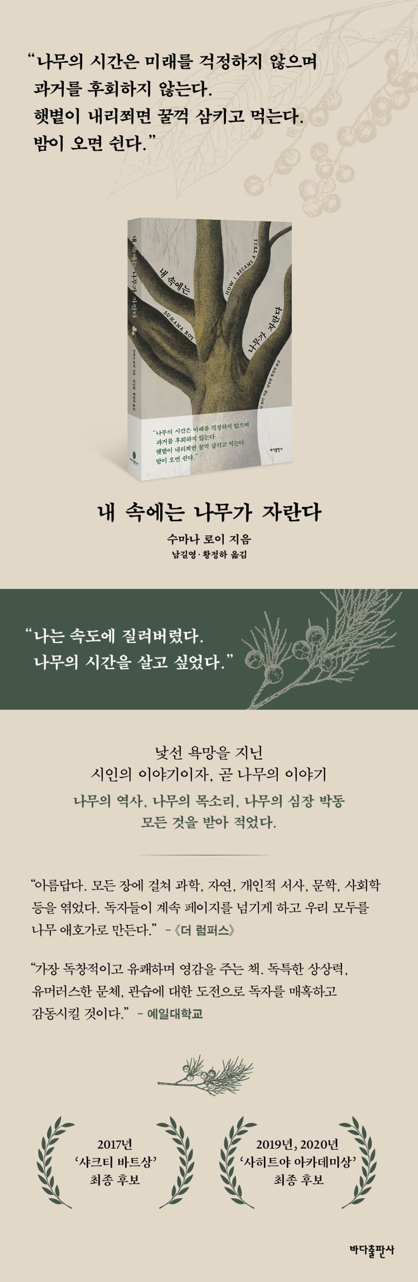 인도 시인 수마나 로이는 기계적인 속도에 지쳐있었다. 같은 인간이면서도 서로를 대하는 편협한 태도에 지쳤고, 소음에 지쳤다. 반면 나무는 가지를 뻗고, 열매를 맺고, 그늘을 드리우는 모든 일을 침묵 속에서 이뤄내고 있다. 문명과 기계의 역사보다도 긴 역사를 나무는 투쟁과 폭력 없이 지켜냈다. 로이는 그런 나무를 탐하고 욕망하기 시작하면서 돌이킬 수 없는 사유의 뿌리를 내린다. 그의 은유적 상상력은 깊이와 넓이의 한계를 모르고 자라는 나무처럼 거대해지고, 시인의 언어는 점점 나무의 활자를 닮아간다. 수마나 로이는 비인간의 감각으로 독특한 작품 세계를 완성하고, 더 나아가 ‘식물-되기’의 새로운 모습을 제안한다.