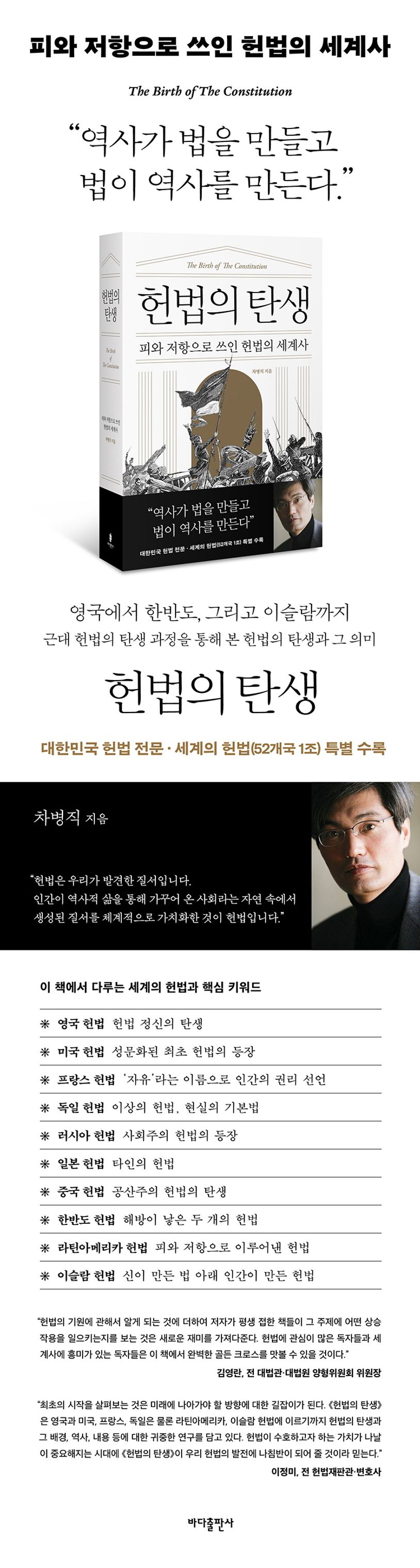헌법을 안다는 것은 ‘그 나라의 정신을 안다’고 할 수 있다. 《지금 다시, 헌법》의 차병직 변호사가 쓴 《헌법의 탄생》은 세계의 다양한 국가들의 헌법적 탄생 과정을 통해 ‘지금의 우리’를 되돌아보고, 나아가 국가의 미래를 보는 기회를 제공한다. 광대한 역사 속 인류는 인권을 위해 끊임없이 투쟁해 왔다. 저자는 미국의 독립 선언과 프랑스 인권 선언 등 세계사의 굵직한 사건들 속에서 시민들의 피와 저항이 어떻게 헌법의 토대를 이루었는지 살펴본다. 더욱이 헌법의 가치가 위협받고 있는 현 시점에서 해방 이후 한반도의 굴곡진 역사 속에서 지금의 우리의 헌법이 어떻게 만들어졌는지 추적하며 그 의미를 밝히고 있다. 저자는 헌법이 특정 국가의 발명품이 아닌 오랜 세월에 걸친 인류 공동체와 민족, 국가, 사회 공동체의 역사와 함께 서서히 형성되었다고 주장하며 근대의 정신인 헌법을 진정으로 이해하기 위해서는 세계사의 맥락에서 헌법을 봐야 한다고 강조한다. 이 책은 영국 ,미국, 프랑스, 독일, 러시아, 일본, 중국, 한국 외에도 북한 라틴아메리카, 이슬람(8개 국가, 2개의 대륙)의 헌법 탄생 과정을 한 권으로 담고 있는 유일한 책이다.