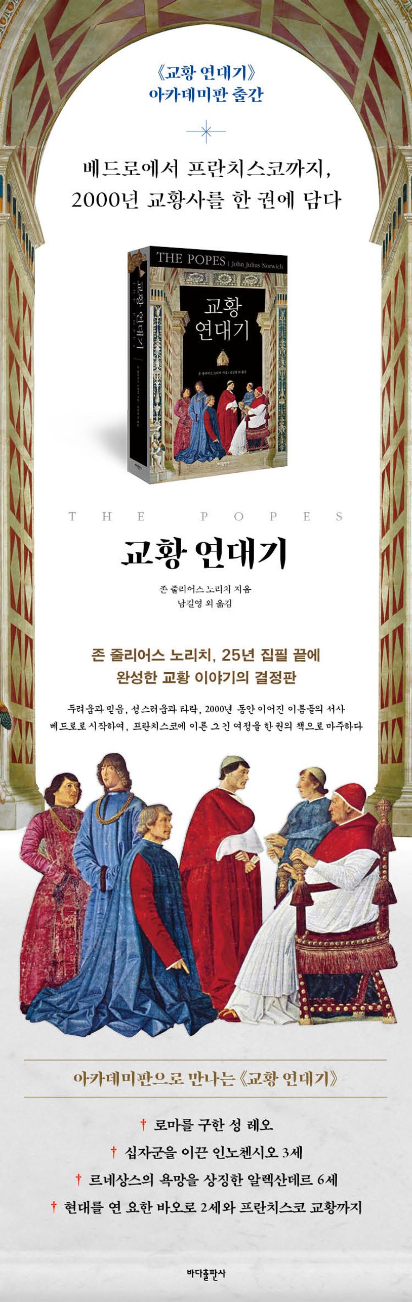 ‘역사의 인디애나 존스’로 불리는 영국 저술가 존 줄리어스 노리치가 이들의 행적을 한눈에 보여준다. 정통 권위를 주장하는 근거에서 이단논쟁, 신성로마제국과의 다툼을 거쳐 바티칸시국의 성립까지 스케이트보드를 타듯 유연하게 그러면서 균형 잡힌 태도로 교황의 역사를 조망했다.