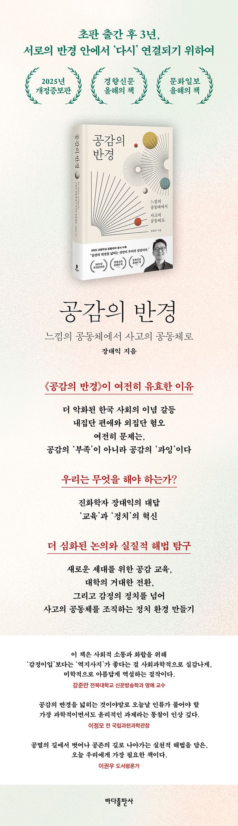 한국사회의반목과갈등은여전히공감의‘부족’이아니라공감의‘과잉’때문이다《공감의반경》개정증보판은초판이출간된후3년동안공감의과잉으로인한갈등과분열이나아진것이아니라더심해졌다는비극적사실에서출발한다.저자장대익은이를단적으로보여주는에피소드를들려준다.“장교수님,《공감의반경》을흥미롭게읽고있어요.최근우리나라정치갈등을이해하는데큰도움이되었어요.올해나온책맞죠?”“아……아니에요.그책은3년전쯤출간되었어요.올해나온책이라느끼셨다면아마도우리사회의갈등이그때나지금이나똑같이반복되고있다는뜻이겠지요.하하.”멀리갈것도없이2024년12월3일초유의비상계엄사태는내집단을편애하고외집단을혐오하는공감의과잉이극한으로치달은사건이다.한국가를이끌어야할지도자가부정선거음모론에심취해반대측의입을막고폭력을행사했다.유튜브채널들은혐오를연료삼아가짜뉴스를퍼뜨리며자기편을모았다.전통언론역시사실검증과중립적보도를포기하고당파적입장에따라혐오를재생산했다.모두가너는누구편인지를따지는데몰두했다.그런데도사람들은여전히이런혼란을없애려면‘공감이필요하다’라고말한다.저자장대익은이런해법이불편하다.그는다시금한국사회에서가장과잉된감정은공감이라고잘라말한다.자신과입장이같은사람에게만작동하는감정적인공감말이다.우리에게부족한건공감이아니다.문제는공감의‘반경’이협소하다는사실에있다.다시말해느낄줄아는능력을넘어타인의입장이되어보는역지사지를어디까지확장할수있느냐다.장대익은아직도우리가공감의반경을확장할수있는방법에대해잘모르고있다는사실을절감하며이개정증보판을썼다.그에따르면공감은구조이고선택이며설계할수있는인지적인태도이다.공감의반경을확장하지못하면대한민국은물론인류의미래는암울하다.이에저자장대익은‘교육’과‘정치’라는인간생활의가장중요한두축에서어떤변혁이일어나야,어떤구조가정착되어야남의입장이되어보는인지적공감을확장할수있는지,어떻게내가당신에게로다가갈수있는지치밀하게탐구한다.《공감의반경》의문제의식은2025년에도여전히유효하다.내새끼지상주의에서벗어나새로운세대를위해공감을교육하기소설가김훈이지적한‘내새끼지상주의’는대한민국의시대정신이됐다.자녀의어떤고통과불편도참지못하는부모의간섭과보호는타인의입장을헤아리는인지적공감을배울기회를빼앗는다.하지만저자장대익은인간이원래부터그랬던것은아니라고지적한다.인간을비롯한영장류는원래‘온마을이나서서’아이를키우는협동양육체제였다.협동양육은대행부모가어린아이들을돌보고부양한다.대행부모는할머니뿐만아니라손위형제자매,이모,이모할머니,아버지,삼촌,심지어이웃집단에서온방문객등여성의출산과자식의생존가능성을돕는모든존재이다.진화생물학자세라블래퍼허디에따르면10만년전만해도지구를구석구석훑어도만날기회가거의없었던호모사피엔스가지구를뒤덮을만큼드라마틱하게확산될수있었던이유는바로협동번식의진화이다.그러나출산과양육이각자도생이되면서내새끼만소중한것이아니라는사실을,나혼자서만아이를키우는게아니라는작각을할수없게되었다.이는부모는물론아이에게도타인의존재를지우는나쁜결과를불러왔다.따라서“내아이를소중히여기듯타인의아이에게도마음을열수있는사회적전환”이야말로아이의미래를위해,인류의지속을위해필요한기초다.저자는다양한과학적근거를동원해부모의통제적양육은아이의성격과진로를결정하지못한다는것을설득력있게보여준다.부모는자신의영향력이가진한계와자녀의삶을보호할수있는범위를명확히인식해야한다.‘자녀에게영혼의집까지줄수는없다.’또한저자는아이들의선천적개성을존중하고운동과스포츠를통해타인과활발히교류할수있는기회를제공하며호기심을증진할수있는환경을조성하는방법이공감의반경을얼마나극적으로늘릴수있는지를여러증거를통해보여준다.교육과공감의반경을논의하는개정증보판에서가장중요한주장은‘대학의거대한전환’을요구하는것이다.이른바‘입결’을통해대학의서열화에만몰두하는우리대학은평가를둘러싼이런부작용은대학의존재이유자체를뒤흔들고있다.대학은“학생의성장과행복,창의성과공감능력,기업가정신의함양,지역사회기여”라는궁극목적을달성하지못하고있다.학생개개인의성장보다선발에만집중하는현세태에서타인의자리에서보는,현실의문제를발굴하고해결하려는모험가적인간은나올수없다.저자는대학의거대한전환이란도전하고실패하고다시일어서는청년을기르는‘기업가적전환’이라고칭하며어떻게그것이가능한지를제도적으로논의한다.감정의정치를넘어사고의공동체를조직하는정치인간은편향된동물이고이런편향은즉각적으로강력한감정에기반을둔다.따라서서로의이해관계를조율해야하는정치에서는이성과인지적공감의발휘보다는감정적갈등과내집단편향이만연하다.우리의과제는감정의정치를넘어서는것이다.그러나우리의지도자는그감정에안주하는것아닌가?지도자가자신만이옳다는도