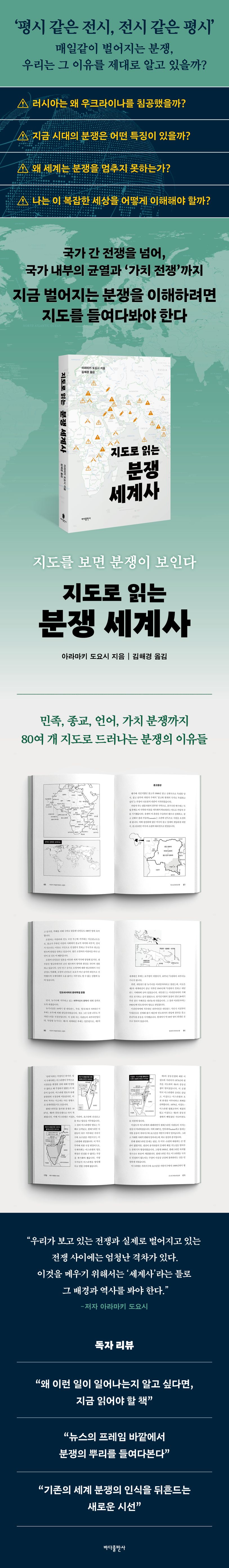 또 다른 장점은 지도를 통한 역사의 이해다. 뉴스와 지식만으로 이해하기 힘들었던 분쟁의 원인과 결과를 지도를 활용해 쉽게 설명한다. 지리적 특성과 그 공간 속에 담겨 있는 민족, 문화, 역사적 근원을 이야기 형식으로 풀어나간다. 제국주의가 힘으로 그어버린 국경선, 정의라는 억지가 갈라놓은 땅이 어떻게 비극을 일으켰는지 입체적으로 보여준다. 상세한 지도로 세계의 분쟁을 한눈에 이해할 수 있도록 이끌어간다.