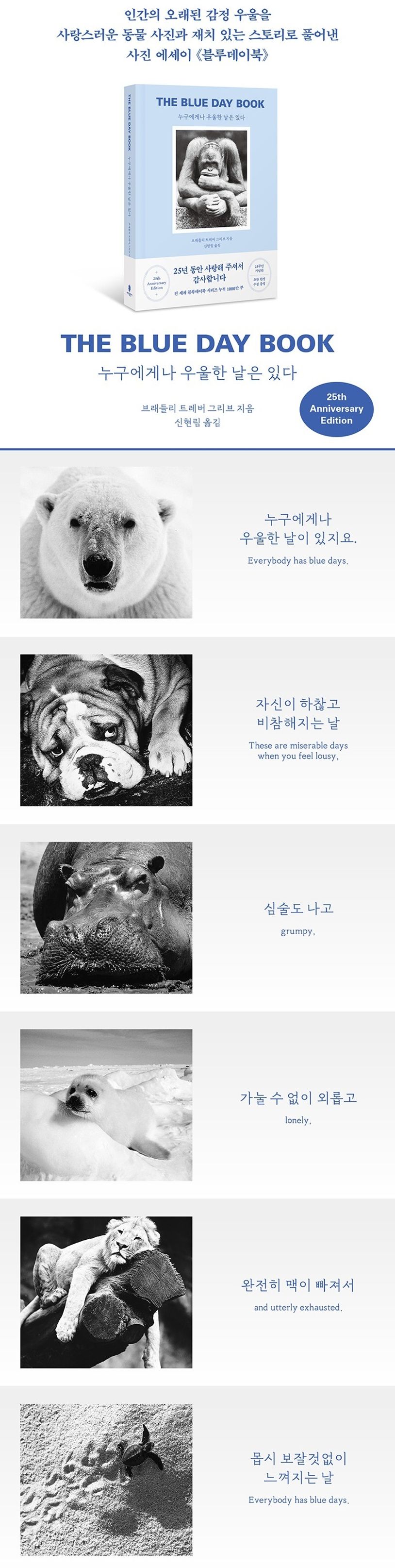 《블루 데이 북》이 커다란 메시지나 주장을 앞세우지 않고도 독자들의 폭넓은 사랑을 받고 있는 것은 공감의 정서로 우리의 감정을 어루만지는 글과 사진의 절묘한 하모니에 있을 것이다. 첫 페이지를 펼친 순간부터 마지막 장을 덮을 때까지 행복한 미소를 머금게 한다. 그 재미의 원천은 글과 사진의 완벽한 조화에 있다. 글 자체는 대단히 평범하고 쉽다. 귀여운 동물들을 담은 흑백사진은 그 자체로 예술이지만, 그것만으로는 그다지 울림이 크지 않았을 것이다. 하지만 이 둘이 만나는 순간, 웃음이 터져 나온다. 동물들의 무의식적인 행위가 인간적인 몸짓으로 의미가 덧씌워지는 순간, 우리는 뜻밖의 즐거움을 발견하고 미소 짓게 된다. 이 책은 기분전환이나 재충전을 위해 가벼운 마음으로 읽을 수 있으며, 일상의 스트레스를 말끔히 날려버릴 수 있는 해독제로서 작용한다.