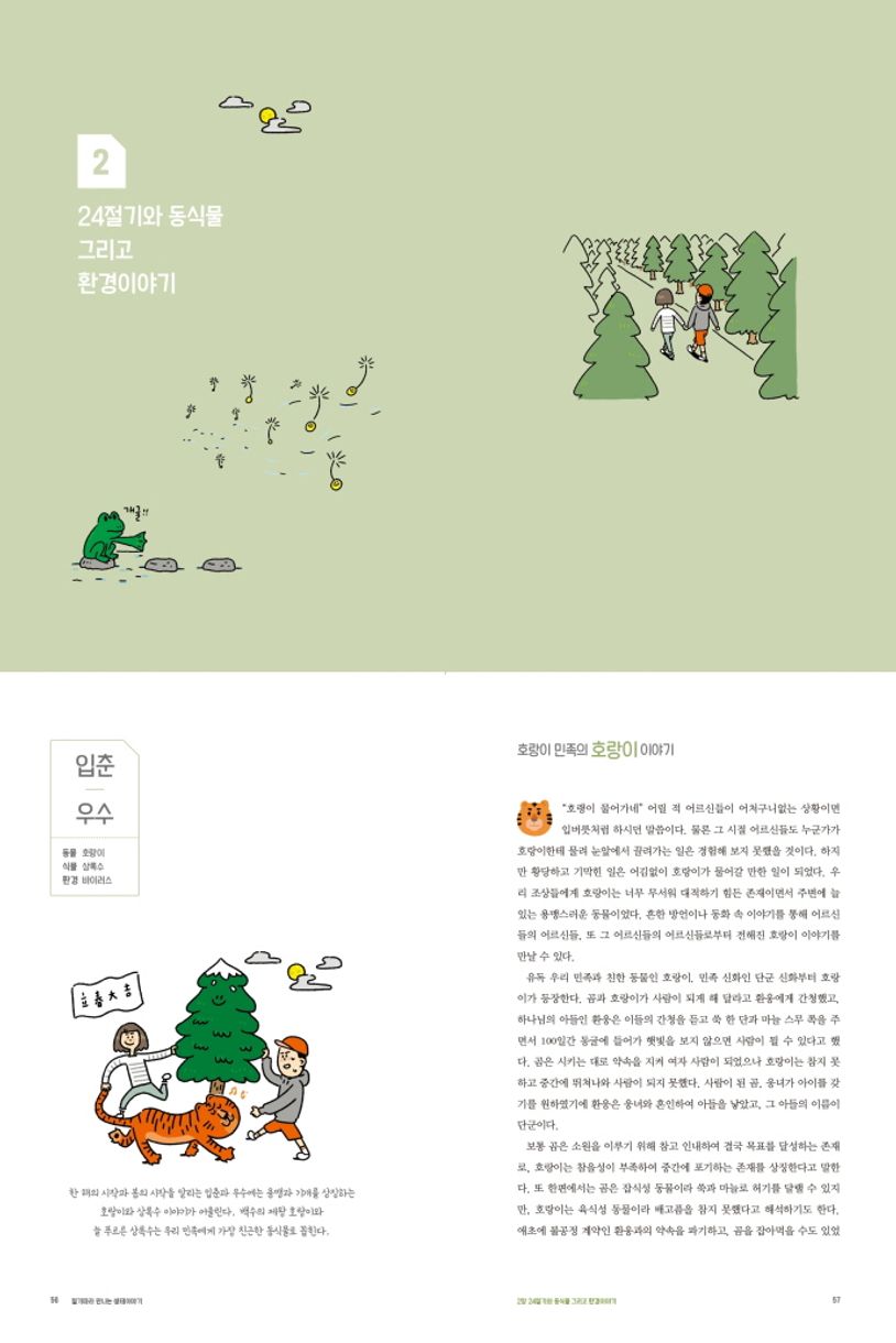 생태교양서《절기따라만나는생태이야기》24절기와동식물이야기를생태환경과접목한구성으로생태지식정보제공,누구나한번쯤꼭읽어야하는생태교양서25명의각분야별연구자들의감수를통한정확하고명확한정보전달<절기따라만나는생태이야기>는24절기의과거와현재를되짚어인류에게다가올기후변화의폐해와그에따른자연보전의필요성을일깨우는계기를마련하고자기획된생태교양서이다.국립생태원소속25명의각분야별연구원들의원고감수를통해정확한생태지식정보제공하고자했으며,글과어울리는이크종화가의삽화로이야기의재미를더했다.국립생태원은사람과자연이조화롭게살아갈수있는환경을만들기위해생태에대한연구와교육,전시기능을담당하고있는국가기관입니다.국립생태원에서는우리나라곳곳의지형적인특징과동식물현황에대한조사및평가를바탕으로생명다양성보전,생태계복원,기후변화등에관한세계적인수준의연구를수행하고있습니다.국립생태원출판부는영·유아부터일반인,전문가에이르기까지대상별특성에따라누구나쉽게접근·이해할수있는다양한유형의수요자맞춤형콘텐츠제공을목적으로하고있습니다.어린이대상의생태정보동화와일반인·전문가대상의생태교양서·생태학술서,사회적취약계층을위한수어영상도서·점자도서등다양한유형의생태관련콘텐츠를개발하여보급하고있습니다.●절기따라만나는생태이야기주요내용및특징총3장으로구성되어1장24절기의인문학적풀이와2장24절기와연관된동식물이야기,3장생태환경지식전달등24절기와연계된다양한내용을수록했다.‘1장24절기의과거와현재’은현대인이24절기를되새기는이유에대해알아보고,농사법의변화와함께24절기를생태계의변화와연결하여다시읽는방법에대한정보를담고있다.‘2장24절기와동식물그리고환경이야기’는24절기의특색에따라2개씩절기를묶어서떠올려볼수있는동물과식물의생태와관련된재밌는이야기들을모았다.2장첫번째단락의‘입춘과우수’에서는호랑이민족의호랑이이야기,상록수곁에서상록수처럼살기,바이러스:인류의천적이될것인가등현재우리의일상에서가장큰쟁점이되는주제들로구성했다.‘3장생태계를위한노력들’은기후와생태계의변화를실감할수있는다양한기후환경정보,일상에서실천할수있는생태보호활동과더불어찰스다윈및제인구달등생태학들의삶을이야기로엮었다.