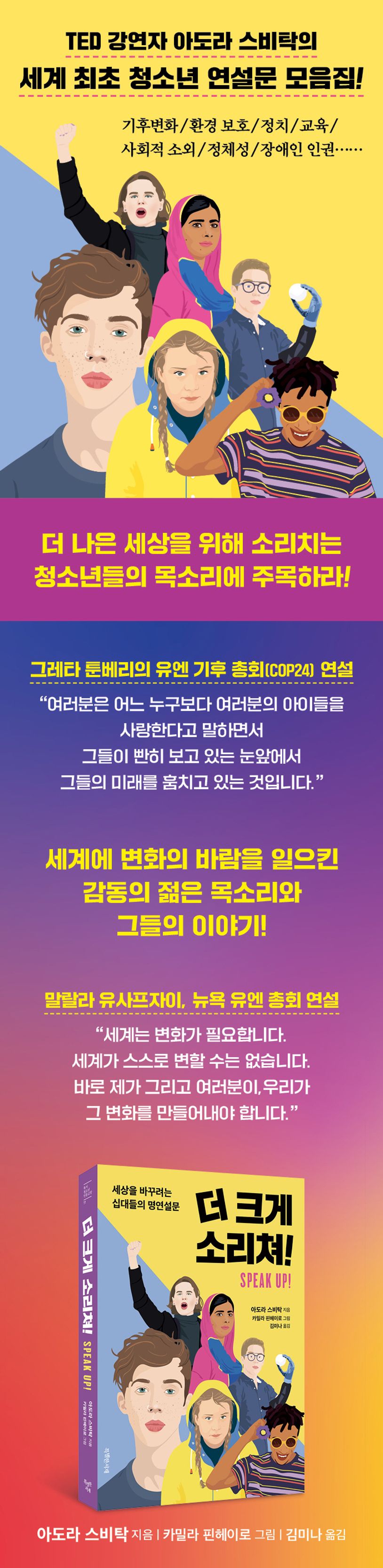 그들의 목소리에 귀를 기울여 보자. 한 사람 한 사람의 목소리가 더해져 세상은 더 나은 방향으로 움직일 것이다. 『더 크게 소리쳐!』는 지금 이 순간에도 ‘질문이 사라진 교실’에 앉아 공부하고 있는 청소년들의 마음속에 세상을 바꾸겠다는 작은 변화의 불씨를 심어줄 단 한 권의 책이다.