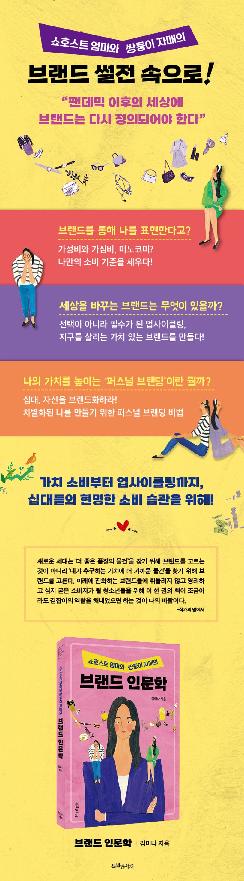 『쇼호스트 엄마와 쌍둥이 자매의 브랜드 인문학』에서는 이처럼 업사이클링, ‘지구세’를 내는 브랜드, 동물 가죽 대신 버섯 가죽을 사용하는 브랜드 등을 소개하며 지구를 지키는 ‘가치 소비’에 관한 메시지를 남긴다. 그러면서도 유행처럼 가치 소비에 휩쓸리기보다는 ‘진짜 환경을 생각한다면 물건은 안 살수록 좋은 거다’라며 자신만의 기준을 확고히 세울 것을 권한다. 단순히 정보 전달이나 좋은 소비를 하길 권하는 것에 그치는 것이 아니라 청소년들이 직접 소비에 관한 기준을 세우도록 돕는 것이 이 책만의 특별함이다.