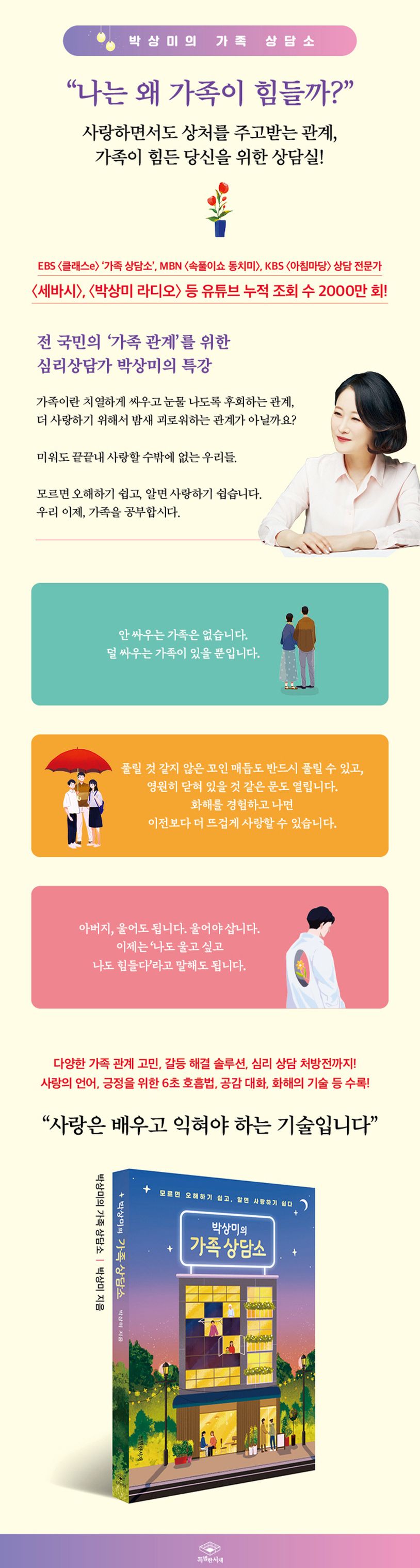 누구보다 가깝고 사랑하지만, 가장 상처를 많이 주고받는 관계. 선택할 수 없기에 평생을 함께해야 하는 ‘가족’ 때문에 힘들어하는 이들을 위해 심리상담가 박상미가 그간 해온 수많은 상담 내용을 바탕으로 한 특별한 가족 상담소의 문을 열었다.