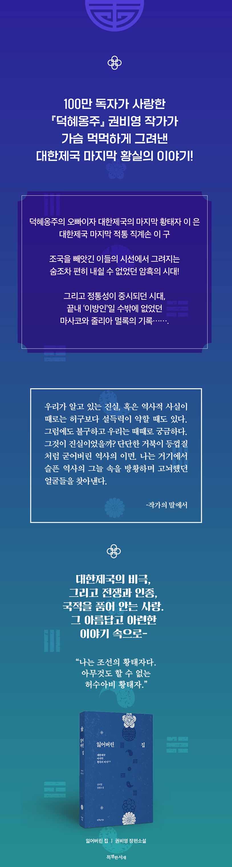 덕혜옹주』로 100만 독자의 사랑을 받은 권비영 작가가 오랜 세월 품어 온 또 다른 대한제국의 이야기, 『잃어버린 집』은 덕혜옹주의 오빠이자 대한제국의 마지막 황태자 이 은, 그리고 대한제국의 마지막 적통 직계손 이 구의 아픈 생을 담은 소설이다.