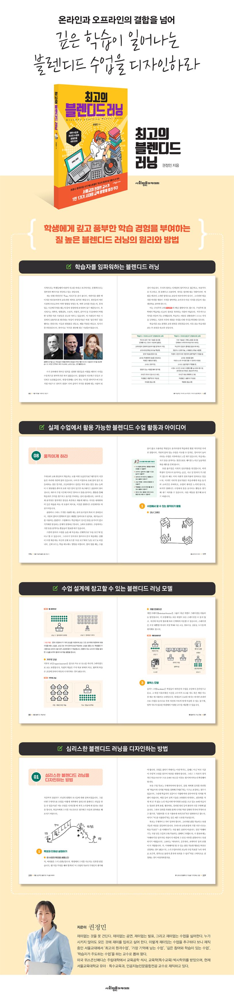 블렌디드 러닝은 오프라인 수업과 온라인 수업의 단순한 결합에 머물러서는 안 된다. 질 높은 블렌디드 러닝의 핵심은 수업에 도입한 테크놀로지를 교사가 아닌 ‘학생’이 직접 사용하는 것이다. 학생은 디지털 기기와 소프트웨어를 사용하여 스스로 생각하고, 문제를 해결하고, 의미와 지식을 만들어 내면서 자기주도적이고 깊은 학습을 할 수 있다. 이 책은 풍부한 학습 경험, 상호작용과 재미, 자기성찰이 있는 ‘최고의 블렌디드 러닝’을 디자인하기 위한 관점과 아이디어들을 제공한다.
