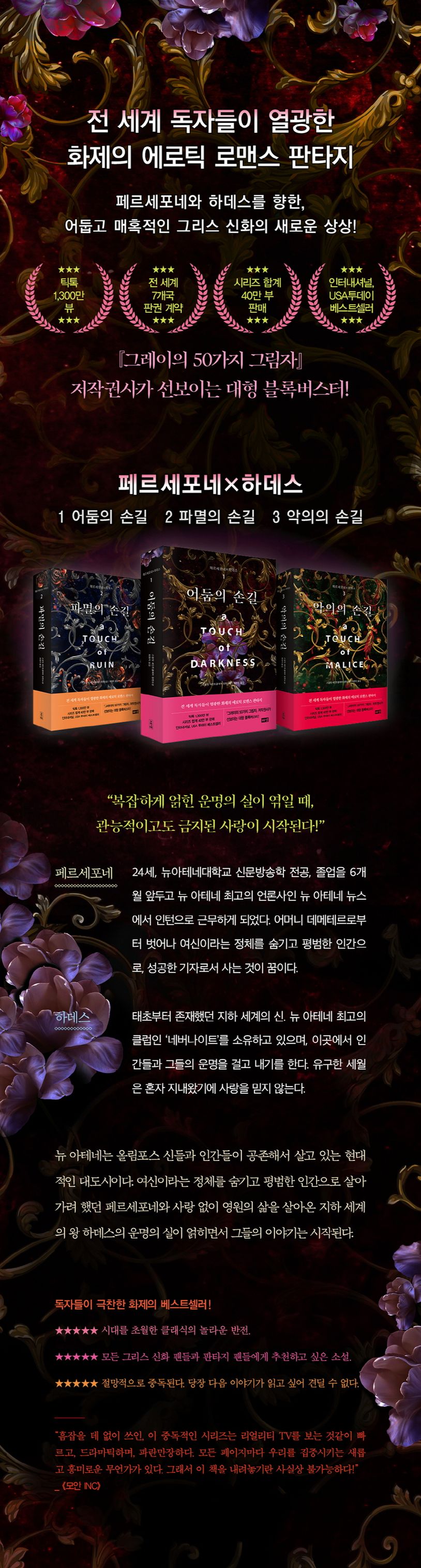 전세계독자들이열광한화제의에로틱로맨스판타지***틱톡1,300만뷰,전세계7개국판권계약시리즈합계40만부판매인터내셔널,USA투데이베스트셀러『그레이의50가지그림자』저작권사가선보이는대형블록버스터!그리스신화속페르세포네와하데스이야기를새로운상상력으로풀어내많은독자들을열광시킨화제의에로틱로맨스판타지,‘페르세포네×하데스’시리즈『어둠의손길』,『파멸의손길』,『악의의손길』이드디어한국독자들을찾는다.2019년,미국에서출간된‘페르세포네×하데스’시리즈는SNS를통해입소문을타게되면서틱톡조회수가1,300만뷰를돌파했고,시리즈합계40만부이상판매되며엄청난화제를일으켰다.‘페르세포네×하데스’시리즈를통해작가로서이름을알린스칼릿세인트클레어는문예창작학을전공하고전업사서로일하며틈틈이글을쓰다가2019년부터자신의소설들을자가출판하기시작했다.저자는언제나그리스신화를사랑해왔고,특히나명암을지닌존재였던봄의여신이자동시에지하세계의여왕인페르세포네에게항상마음이갔다고밝혔는데,그렇기때문에‘페르세포네×하데스’시리즈가세상에나온건어쩌면필연적인일이었을것이다.고대그리스신화를현대로불러와자신만의세계와인물로재해석해탄생한‘페르세포네×하데스’시리즈가SNS에서화제를일으키며인터내셔널,USA투데이베스트셀러에오르자블룸북스(BloomBooks)는그녀의모든작품을출간하기로결정하고스칼릿세인트클레어와계약을맺는다.블룸북스는경쟁력있는여성작가들을유치하기위해2021년초소스북스(Sourcebooks)에서런칭한새로운임프린트로,베스트셀러작가E.L.제임스가『그레이의50가지그림자』시리즈전작을기존펭귄랜덤하우스에서블룸북스로옮겨오게되었다고발표하면서출판계의주목을받기도했다.스칼릿세인트클레어가블룸북스에합류하게되었다는것은그만큼그녀의작품들이흥행보증수표로인정받았다는의미이기도하다.‘페르세포네×하데스’시리즈는미국에서첫선을보인후한국을포함하여전세계7개국에서판권계약을완료했고,2022년가을,마침내한국독자들을만나게되었다.“나는언제나그리스신화를사랑해왔다.신화속이야기들은기이하고폭력적이며잔인했는데,하데스와페르세포네이야기에서나는항상봄의여신이자동시에지하세계의여왕인페르세포네에게마음이갔다.다른많은이들처럼,그녀역시명암을지닌존재였기에.”_작가의말중에서페르세포네와하데스를향한,어둡고매혹적인그리스신화의새로운상상!페르세포네:24세,뉴아테네대학교신문방송학전공,졸업을6개월앞두고뉴아테네최고의언론사인뉴아테네뉴스에서인턴으로근무하게되었다.어머니데메테르로부터벗어나여신이라는정체를숨기고평범한인간으로,성공한기자로서사는것이꿈이다.하데스:태초부터존재했던지하세계의신.뉴아테네최고의클럽인‘네버나이트’를소유하고있으며,이곳에서인간들과그들의운명을걸고내기를한다.유구한세월은혼자지내왔기에사랑을믿지않는다.뉴아테네는올림포스신들과인간들이공존해서살고있는현대적인대도시이다.여신이라는정체를숨기고평범한인간으로살아가려했던페르세포네와사랑없이영원의삶을홀로살아온지하세계의왕하데스의운명의실이얽히면서이야기가시작된다.“겨울의폭풍이여름의태양을집어삼키고,이제,전쟁의약속외에확실한것은없다.”데메테르는페르세포네와하데스를향한보복으로눈보라를끊임없이불러일으키며뉴아테네를황폐화시킨다.한편더이상신들의지배를받지않겠다고주장하는인간세력들은신들을공격하며테러를일으키고,끊이지않는눈보라로신들에게반감을갖는이들이늘어나면서새로운세상에대한목소리가높아진다.계속되는테러에올림포스신들은마침내개입하기로결정하지만,페르세포네와하데스의운명을둘러싸고의견이갈리며분열한다.신들은과연페르세포네와하데스의편에서서데메테르와의전투에나설것인가,아니면둘의결합을막고죽은자들의신에대항해무기를들것인가.“페르세포네,누구도우리를떼어놓지못할겁니다.운명의여신들도,당신어머니도,제우스조차도.”이시리즈를통해스칼릿세인트클레어는세상의그무엇보다모험과열정을원하는페르세포네를탄생시켰다.그녀는절실하게있는그대로의자신을증명하고,인정받고싶어한다.스스로를실패자라고여기던페르세포네가하데스를만나그를이해하며성장하고,봄의여신이자궁극적으로는지하세계의여왕으로서자신의힘을받아들이는과정은독자모두에게와닿을것이다.『어둠의손길』에서페르세포네가어떤모습이었는지,『파멸의손길』에서어떻게고군분투했는지,그리고『악의의손길』에서그녀가결국어떤존재가되어가는지를돌이켜보면페르세포네의여정은우리에게희망을준다.고난과트라우마와슬픔은우리를더욱강하게만들어준다는점을그녀가일러주기때문이다.빠르고,드라마틱하며,파란만장한이중독적인이야기는무서운흡입력으로독자들을매료시킬것이며,에로틱하면서도아름답게표현되는페르세포네와하데스의관능적인로맨스는독자들에게또다른짜릿함을선사할것이다.미국에서는‘페르세포네×하데스’시리즈의폭발적인인기에힘입어네번째