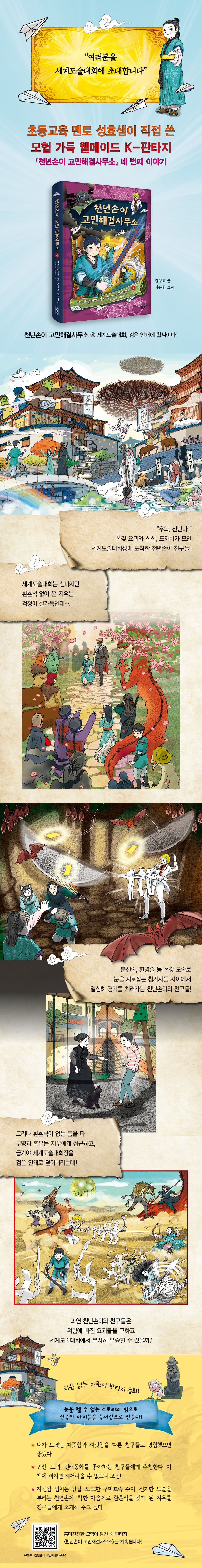 동양의 옛이야기를 바탕으로 흥미진진한 모험 이야기를 풀어내어 많은 사랑을 받아온 『천년손이 고민해결사무소』 4권이 출간됐다. 1권에서는 인간 소년 지우가 선계 배틀에 이겨 환혼석의 주인이 되고, 2권에서는 무릉도원으로 휴가를 갔다 엉뚱한 사건이 휘말리며, 3권에서는 저승에 가서 환생꽃을 구해오기 위해 위험천만한 모험을 펼친 천년손이 4인방은 4권에서 온갖 요괴들이 모인 대회에 나가 제대로 도술 실력을 겨룬다. 특히 이번 편은 지우가 무명의 꾐에 빠져 처음으로 악한 마음을 먹기도 하고, 악당 무명과 흑무가 점점 그 모습을 드러내는 등 긴장감을 높여 흡입력 있는 이야기를 선보인다.