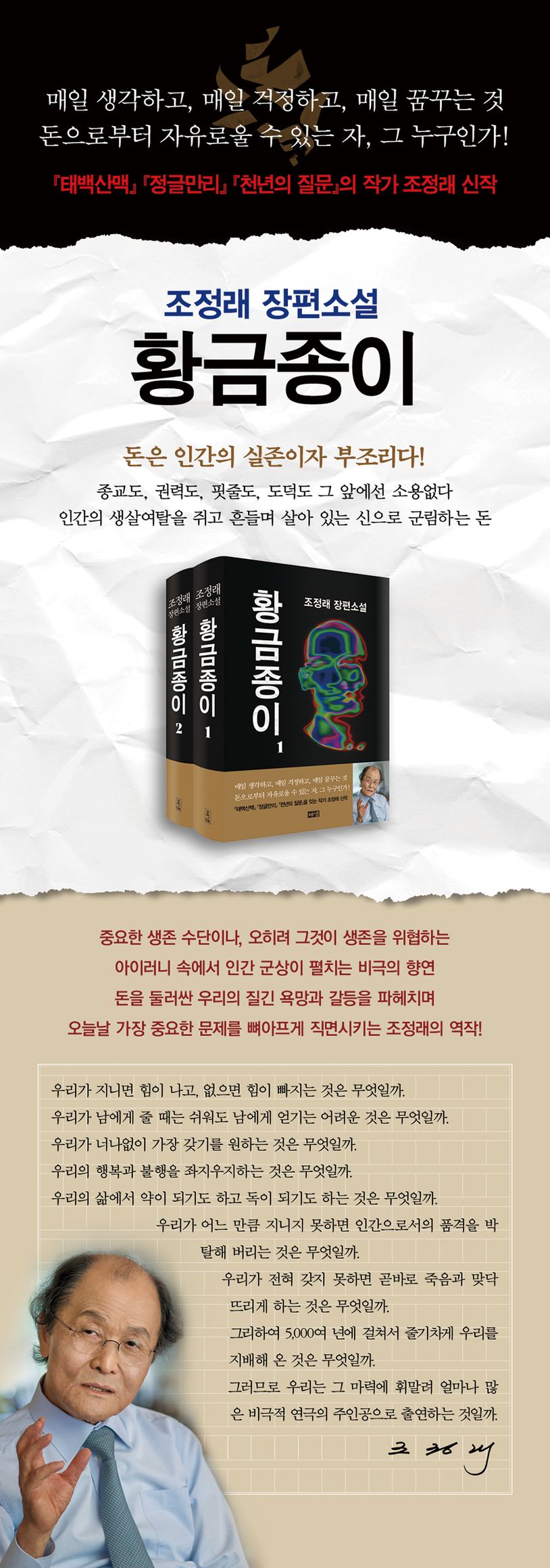 ‘대한민국 근현대 3부작’인 대하소설『태백산맥』『아리랑』『한강』으로 1천5백만 독자들에게 우리 현대사의 참모습을 알리고, 장편소설『정글만리』『풀꽃도 꽃이다』『천년의 질문』을 통해 오늘날 한국 사회를 관통하는 핵심 문제들을 정면으로 다루어왔던 조정래 작가. 그가 4년 만에 신작 장편소설『황금종이』(전2권)를 출간한다. 원고지 약 1,800매 분량의 이 작품에서는 돈을 둘러싼 인간 군상들의 비극의 향연이 펼쳐지며, 황금만능주의로 비인간화되어 가는 세태에 경종을 울린다.