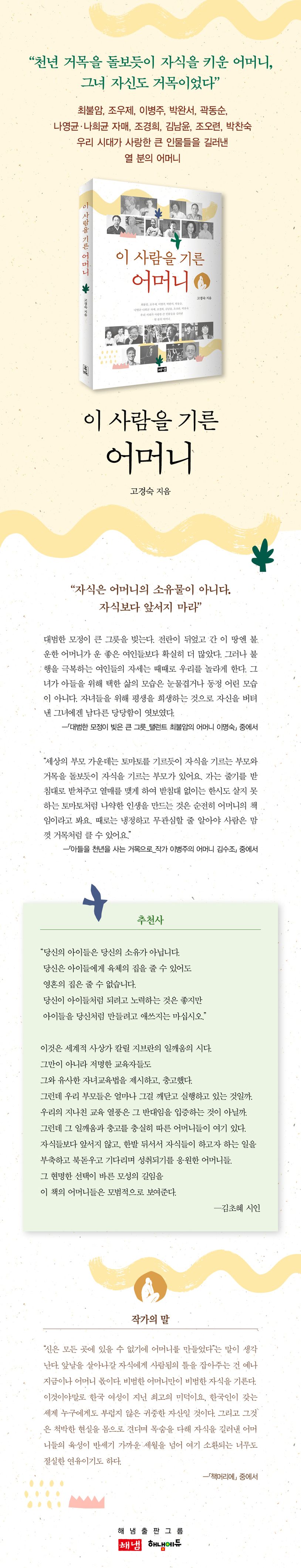 이 명사들이 한창 전성기를 누리던 1970년대 후반, 어린 자녀를 두었던 소설가 고경숙은 당대를 휩쓴 19인의 각계 명사와 그 어머니들을 탐방 취재했다. 남다른 자녀교육의 철학과 비결을 전하는 이 인터뷰 시리즈는 「이 사람을 기른 어머니」라는 제목으로 1977년부터 1978년까지, 2년간 《여성동아》에 연재되며 대중의 큰 사랑을 받았다. 그로부터 40여 년이 지난 오늘날, 자녀를 대하는 과거와 현재의 인식은 크게 달라졌음에도 아이를 훌륭하게 성장시키려는 어머니들의 다짐만은 세월과 무관하게 한결같다. 더군다나 근 몇 년 사이 팬데믹과 교권침해 이슈가 급부상하며 가정학습의 중요성이 대두되자, 저자는 옛 어머니들의 정통적인 가르침을 다시 한번 이 땅에 소환하기로 했다.