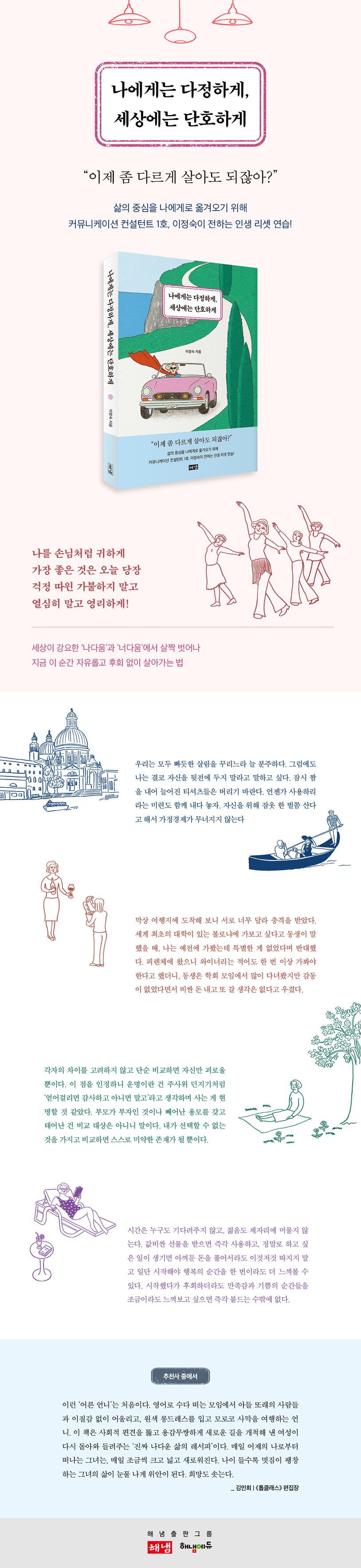 KBS 공채 3기 여성 아나운서, 40대 중반 미국 유학, 베스트셀러 작가, 잘 성장한 두 아들…… 국내에 ‘대화법’ 열풍을 일으킨 베스트셀러『유쾌한 대화법』의 이정숙 작가가 써내려간 ‘삶의 이력서’다. 누구보다 화려하고 도전적이었을 것 같지만, 여기 반전이 있다! 도발적인 첫 책이 일으킨 사회적 파장에 되려 용기를 잃고, 아이들 학비를 위해 쉴 새 없이 집필하고 강의를 다녀야 했던 ‘생계형 작가’였다. 잘못 산 영양제 하나에도 며칠 밤을 자책하고, 나를 먼저 챙기는 일엔 죄책감이 앞서고, 아무것도 하지 않는 시간엔 불안했다. 이런 것이 자기다운 거라 믿으며 꾸역꾸역 수십년간 고수해 왔다.