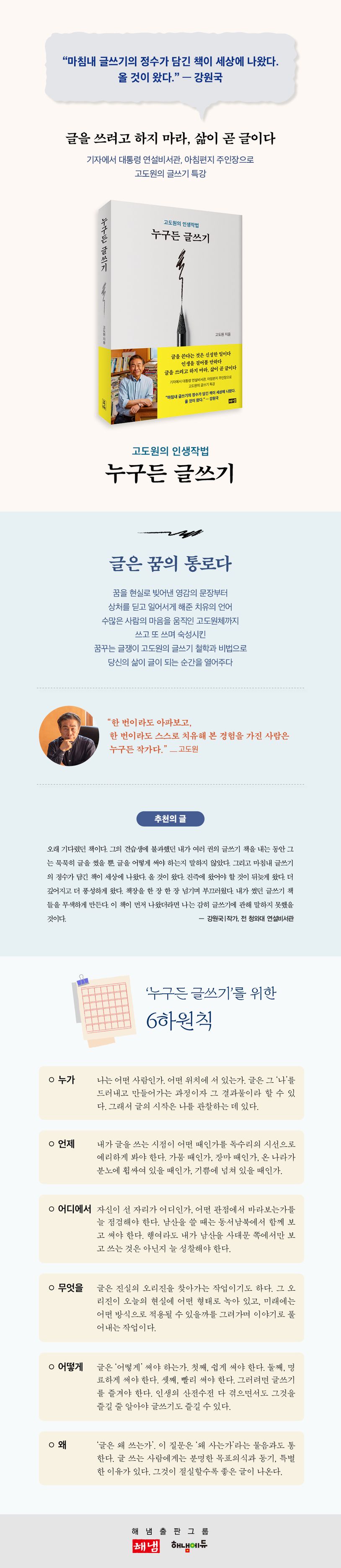 이후에도 그의 글은 아침편지와 깊은산속 옹달샘의 중대한 기로마다 물길을 트고 위기를 넘어서는 변곡점이 되어주었다. 그렇기에 고도원 작가의 글쓰기를 한마디로 요약하면 ‘꿈을 이루는 글쓰기’라고 할 수 있다. 글은 기회가 되고 돈이 되고 에너지가 되고 구심점이 되었다. 40여 년간 기자의 글쓰기에서 대통령의 글쓰기로, 그리고 치유의 글쓰기로 영역을 확장해 온 그의 글쟁이 인생과 글쓰기 비법을『누구든 글쓰기』에 담아냈다.