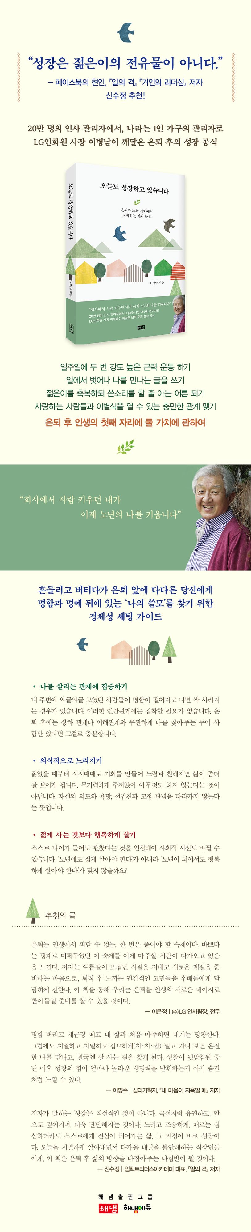 그는 나름 경제적으로 심리적으로 은퇴를 잘 준비했다고 생각했지만, 막상 닥치고 보니 신체 노화와 함께 사회적 자아가 단절된 듯한 불안감과 우울을 겪는다. 그리고 대형 세단을 타고 8차선 고속도로를 질주하는 것 같던 인생의 속도와 방향을, 비포장 국도를 달리는 속도와 방향으로 바꾸어야 함을 깨닫는다. 이러한 경험과 성찰을 바탕으로 은퇴 후 방황하는 이들이나, 은퇴를 앞둔 인생의 후배들이 지금부터 챙기면 좋을 삶의 태도를 이 책 『오늘도 성장하고 있습니다』에 담았다.