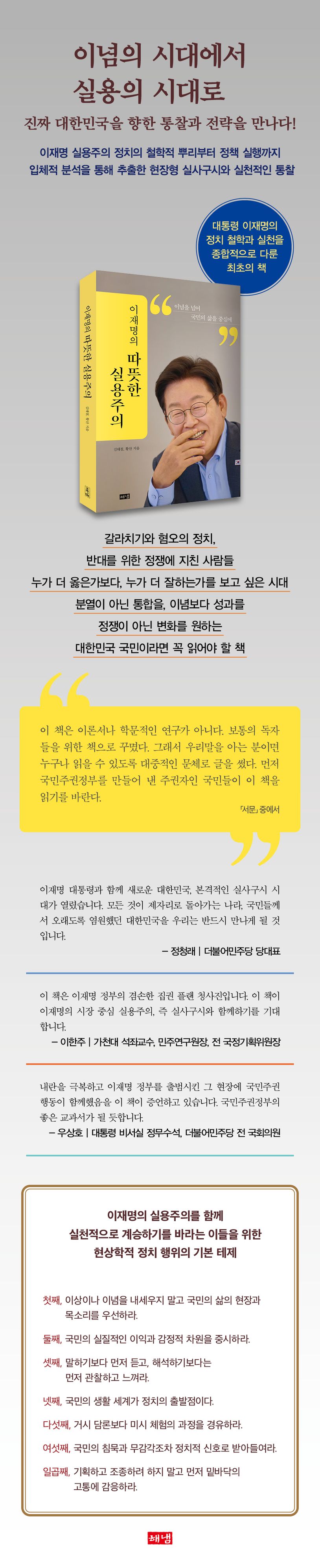 지금한국사회의갈등지수는OECD국가중최상위권이다.증오,혐오…우리사회는분열되어갈등을거듭하고있다.특히진보와보수간의이념적갈등은더욱심각하다.이는반드시극복해야할대상이다.동시에급변하는국내외의환경속에서국민들의삶의질을꾸준하게높여야할필요도있다.이재명정부는이러한상황속에서‘통합’과‘실용’을본격적으로표방하였다.그의실용주의는통합을바탕으로하기에따뜻하며,단순한정치전술이아니라우리의삶에큰영향을미치는시대정신이라할수있다.