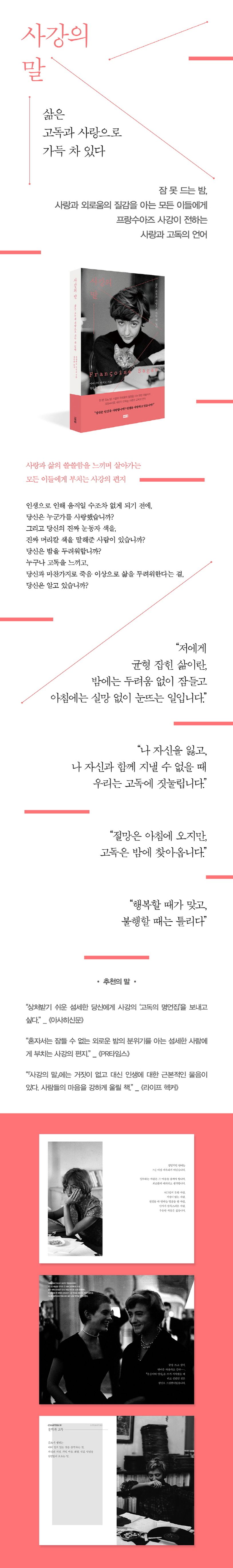 프랑수아즈 사강의 사랑과 고독에 관한 말을 엮어낸 『사강의 말』. 사강은 인생에 대한 사탕발림 같은 환상을 벗어버리고 냉정하고 담담한 시선으로 인간의 고독과 사랑의 본질을 그리는 작가이다. 도덕에 얽매이지 않는 자유로운 감성과 섬세한 심리묘사로 여전히 전 세계의 많은 독자들의 사랑을 받고 있는 프랑수아즈 사강. 『사강의 말』에서 사강은 사랑과 고독은 인생에서 가장 중요하게 다뤄야 하는 것이라고 말한다. 사랑과 고독 없이 우리는 살아갈 수 없다며 사랑과 고독, 인생에 대한 이야기를 풀어낸다.