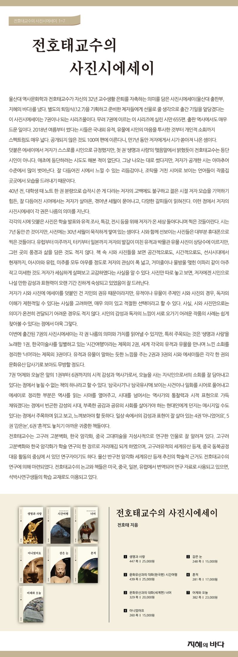 울산대 역사문화학과 전호태교수가 자신의 32년 교수생활 은퇴를 자축하는 의미를 담은 사진시에세이(지혜의 바다)를 냈다. 별도의 퇴임식(12.7)을 기획하고 준비한 제자들에게 선물로 줄 생각으로 출간 기일을 앞당겼다는 이 사진시에세이는 7권이나 되는 시리즈물이다. 무려 7권에 이르는 이 시리즈에 실린 시만 655편. 출판 역사에서도 매우 드문 일이다. 2018년 여름부터 썼다는 시들은 국내외 유적, 유물에 시인의 마음을 투사한 것부터 개인적 소회까지 스펙트럼도 매우 넓다. 공개되지 않은 것도 100여 편에 이른다니, 만7년 동안 저자에게서 시가 쏟아져 나온 셈이다.