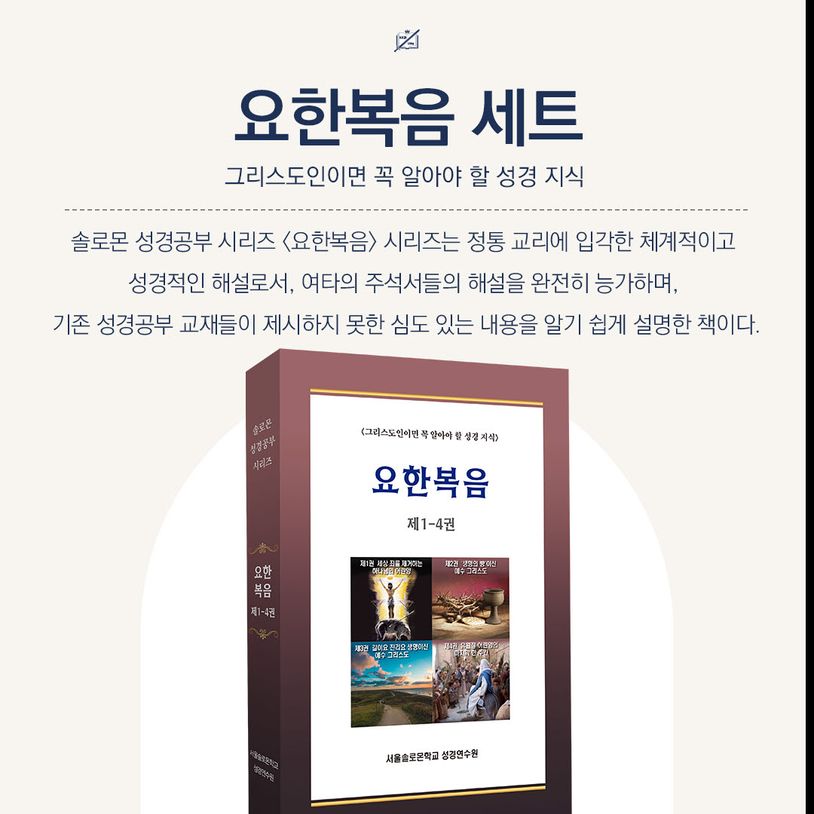 솔로몬 성경공부 시리즈 〈요한복음〉 시리즈는 정통 교리에 입각한 체계적이고 성경적인 해설로서, 여타의 주석서들의 해설을 완전히 능가하며, 기존 성경공부 교재들이 제시하지 못한 심도 있는 내용을 알기 쉽게 설명하였기에 가히 “성경공부”의 왕도를 제시하는 책이다.