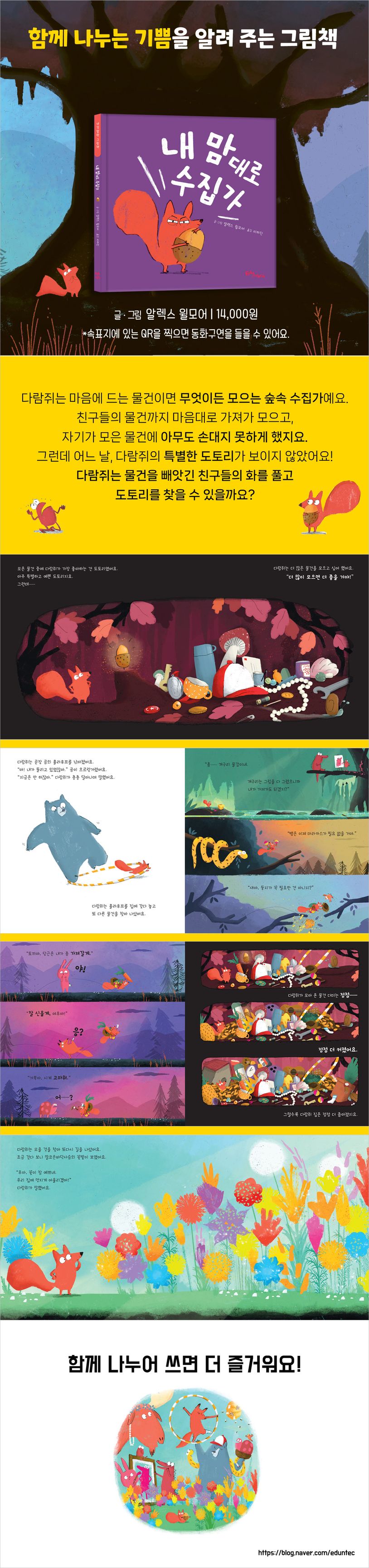 〈내 맘대로 수집가〉는 멋대로 물건을 모으던 다람쥐가 달라지는 이야기를 통해 함께 나누어 쓰는 기쁨을 알려 주는 그림책입니다. 물건을 함께 쓰는 공유의 개념과 화가 나는 상황에서도 다람쥐를 위해 도움의 손길을 뻗은 동물 친구들을 통해 관용에 대해 배울 수 있습니다.