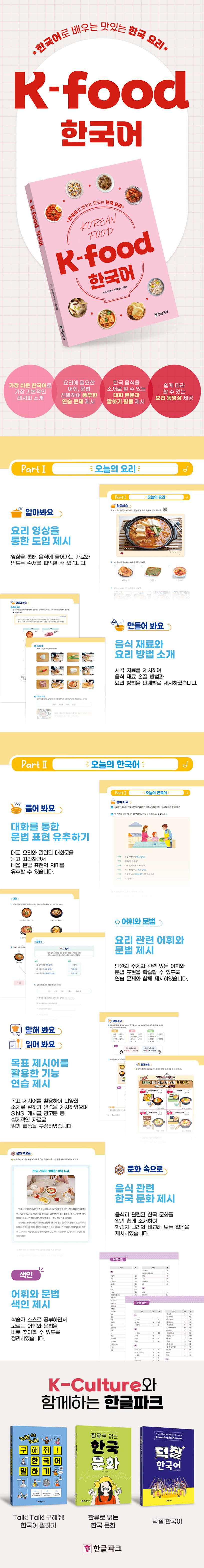 전 세계적으로 한국 음식의 인기가 나날이 높아지고 있습니다. 한국 영화, 드라마에 나오는 맛있는 음식들과 함께 한국어를 더 잘 알게 되고 재미있게 배울 수 있으면 얼마나 좋을까요? 한국어를 배우면서 한국 음식을 직접 만드는 방법도 배울 수 있으면 더 좋겠지요? 그래서 이 책이 만들어졌습니다. 이 책은 한국 음식과 한국어를 배우고 싶어 하는 학습자들을 위해 개발된 책입니다.