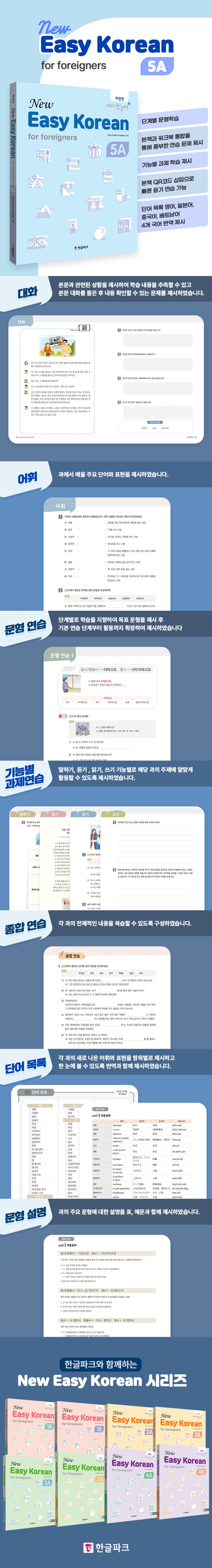 『New Easy Korean 5A』는 New Easy Korean 시리즈의 고급 교재입니다.