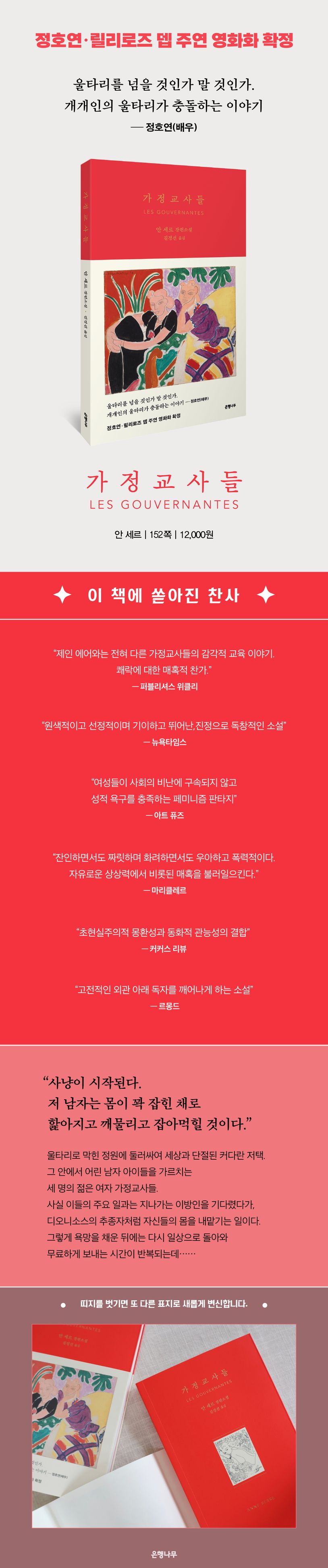 단편소설 부문 공쿠르상을 수상하고 페미나상과 아카데미프랑세즈 소설 대상 등 유수의 문학상 후보에 오르며 현대 프랑스 문단에서 확고한 입지를 다진 작가 안 세르의 첫 장편소설 《가정교사들》이 국내에 처음으로 출간됐다. 최근 영미권에 번역되어 비평계의 찬사를 받았으며, 한국 배우 정호연을 캐스팅한 영화화 소식이 잇따라 발표되면서 큰 화제를 불러일으켰다.