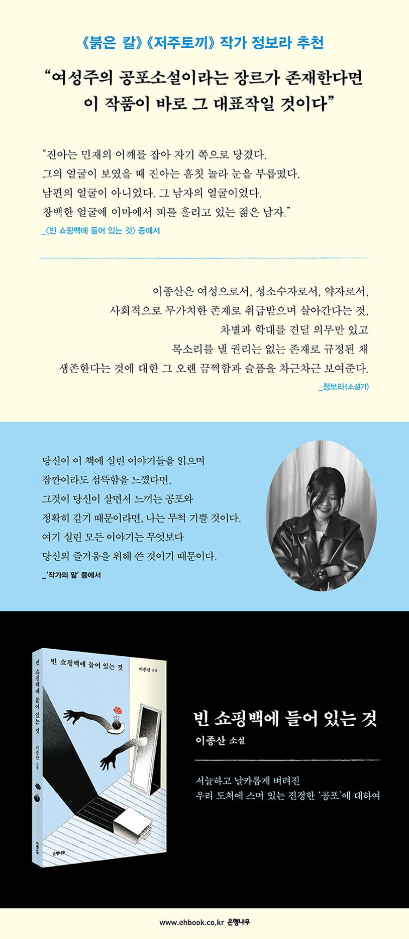 ‘전혀 새로운 감각의 출현’이라는 찬사와 함께 제1회 문학동네대학소설상을 받으며 작품 활동을 시작한 이종산의 첫 번째 소설집이 출간됐다. ‘공포’를 키워드로 한 일곱 편의 소설이 실린 《빈 쇼핑백에 들어 있는 것》은 2022년 서울국제도서전 ‘여름 첫 책’으로 선정되어 지난 도서전 기간 동안 독자들의 뜨거운 관심을 받았던 신작이기도 하다.