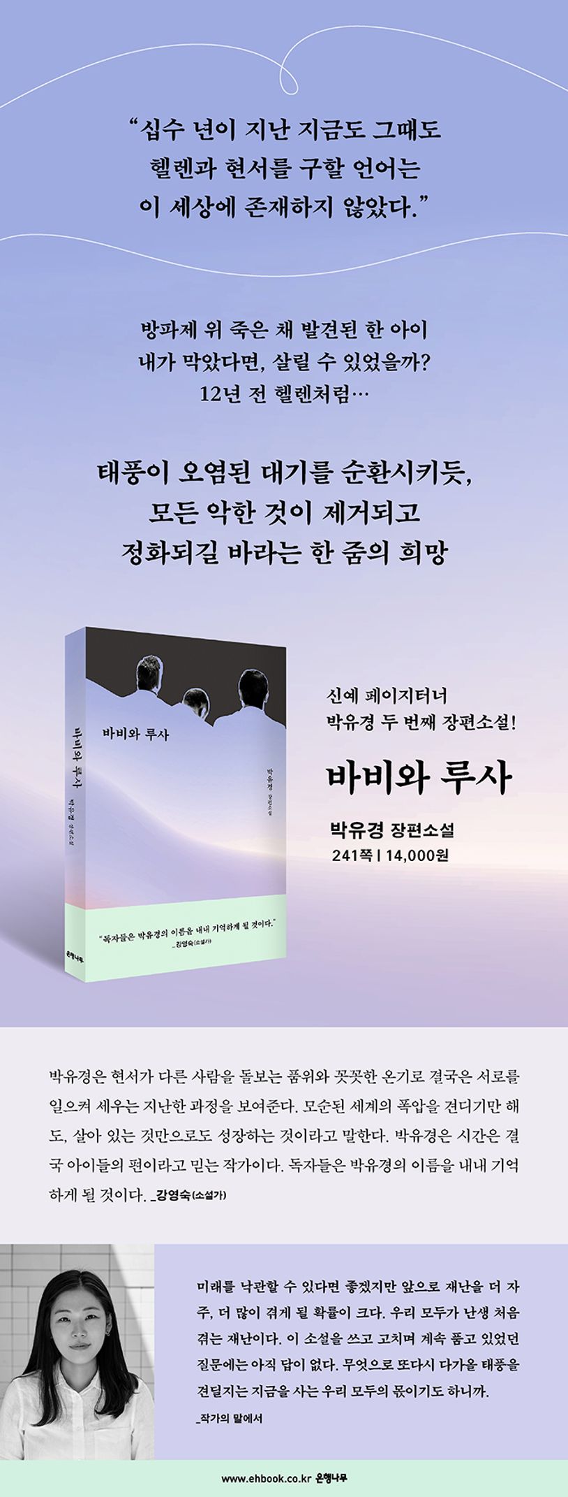 인간의 감추고 싶은 얼룩을 끊임없이 상기시키며 일상의 파탄을 극한으로 끌고 가는 집요함을 선보인 2017년 한경신춘문예 당선작 《여흥상사》로 신예 페이지터너의 등장을 알린 박유경의 두 번째 장편소설 《바비와 루사》가 은행나무출판사에서 출간되었다. 이번에 출간된 신작 장편 《바비와 루사》는 남해 지역 한 섬에서 벌어지는 아동학대 폭력 사건을 통해 어린 시절 끔찍한 폭력을 당했던 주인공이 자신과 비슷한 상황에 놓인 피해 아동을 폭력에서 구출하고 삶의 의미에 대해 되묻는 소설이다. 이 작품에서 박유경은 세상의 악과 감추고 싶은 인간의 어두운 얼룩들을 전면에 내세우고 묵직한 문장과 사회학적 상상력을 더해 아동폭력 피해자가 또 다른 폭력 피해자를 구원한다는 공감대와 연대의지를 보여준다. 또한 작가는 이 작품을 통해 문학이, 아동에겐 재난이랄 수 있는 폭력 속에서도 살아남아 어른으로 성장하며 온전한 삶의 모습으로 회복되길 바라는 희망에 관여하는 방식을 보여준다.