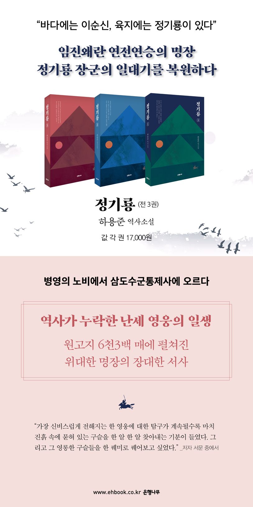 “바다에는 이순신, 육지에는 정기룡이 있다” 임진왜란 당시 경상도 지역을 중심으로 영웅으로 칭송받던 정기룡 장군의 일대기가 소설로 복원되었다. 정기룡 장군은 그동안 베일에 가려져 있던 인물로, 분명히 실존했음에도 믿기 어려운 전설적 일화들이 뒤섞이면서 대중적으로 널리 알려지지도, 역사적으로 비중 있게 조명 받지도 못했다. 장편소설 《정기룡》(전3권)은 그동안 우리 역사가 주목하지 않았던 국난의 영웅 정기룡의 일생을 원고지 6천매가 넘는 생동감 넘치는 대서사로 되살려냄으로써 대하 역사소설이 갖는 장대한 소설적 재미와 전장의 전술과 지략을 통해 난세를 헤쳐 나가는 지혜를 선사한다.