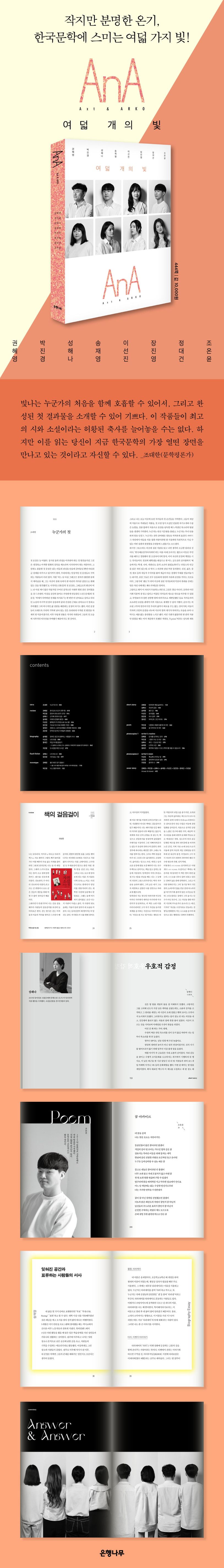 문화예술위원회(ARKO) 한국예술창작아카데미 선정 차세대 예술가 8인의 작품집 《여덟 개의 빛》이 출간된다. 문학잡지 《Axt》와 연계하여 작가의 시와 소설뿐 아니라 인터뷰와 수필, 대중문화 평론, 리뷰 등 다양한 산문을 함께 기획하여 해마다 한 권으로 소개하는 ‘AnA 시리즈’의 세 번째 책이다. 올해의 주인공은 소설가 권혜영, 성해나, 송재영, 이선진, 장진영, 정대건, 시인 박진경, 조온윤 8인이다. 가장 낮은 곳까지 스미는 다정한 온기처럼, 여덟 명의 작가가 그려낸 여섯 편의 소설과 스무 편의 시에는 그들이 감각하는 작지만 분명한 빛이 담겨 있다. 커버스토리 인터뷰에는 글에 대한 진지한 고민도 함께 실려 그들의 글에 무게를 더한다. 한편 《여덟 개의 빛》에 실린 다종다양한 산문에는 작가들이 눈길 주는 사회의 여러 모양이 담겼다. 동시대를 살아가는 우리들에게 가장 온전하게 다가올 이야기들이 독자를 기다린다. 젊은 작가들의 다양한 글을 만나볼 수 있는 AnA의 세 번째 시리즈, 《여덟 개의 빛》에 실린 이 다양하고 따스한 글들이 그들의 독자들을 만날 수 있기를 기대해본다.