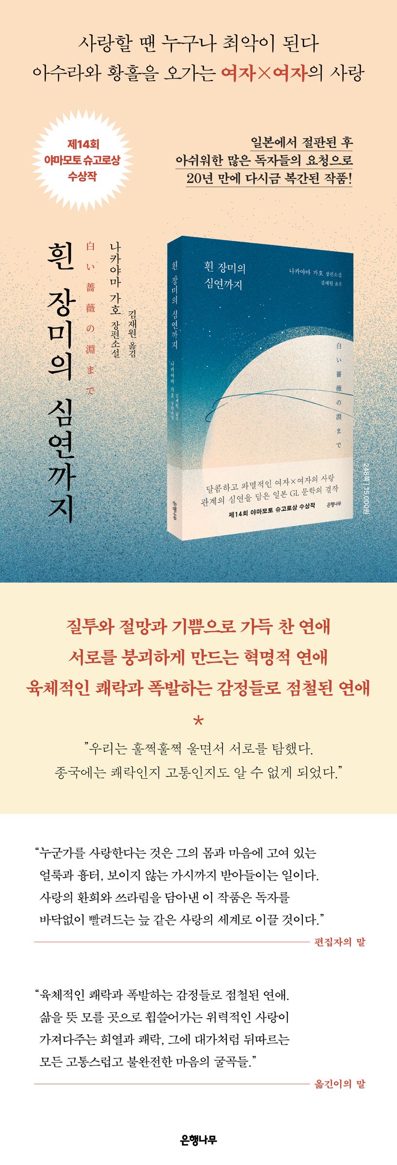 관계 속에 흐르는 에로스를 아름답게 그려내는 작가 나카야마 가호의 대표작 《흰 장미의 심연까지》가 은행나무에서 출간되었다. 연애소설을 포함해 여러 장르를 넘나들며 꾸준히 작품을 집필해온 작가는 이 소설을 통해 사랑의 가장 뜨겁고도 서글픈 순간을 보여준다. 평범한 삶을 살아온 스물아홉 살의 도쿠코. 그녀는 어느 날 고양이처럼 치명적인 매력을 가진 연하의 여성 루이와 달콤하지만 파멸적인 사랑에 빠져든다. 작가 스스로 “젊을 때가 아니면 불가능한 기세와 절실함이 응축되어 있으며, 두 번 다시 쓸 수 없는 마지막 청춘소설”이라고 표현했을 만큼, 이 사랑 이야기에는 국내 처음으로 소개되는 나카야마 가호의 가장 순수하고 치열했던 마음이 깃들어 있다. 섬세한 감정선을 따라 사랑의 환희와 쓰라림을 담아낸 《흰 장미의 심연까지》는 독자를 바닥없이 빨려드는 늪 같은 사랑의 세계로 이끌 것이다.