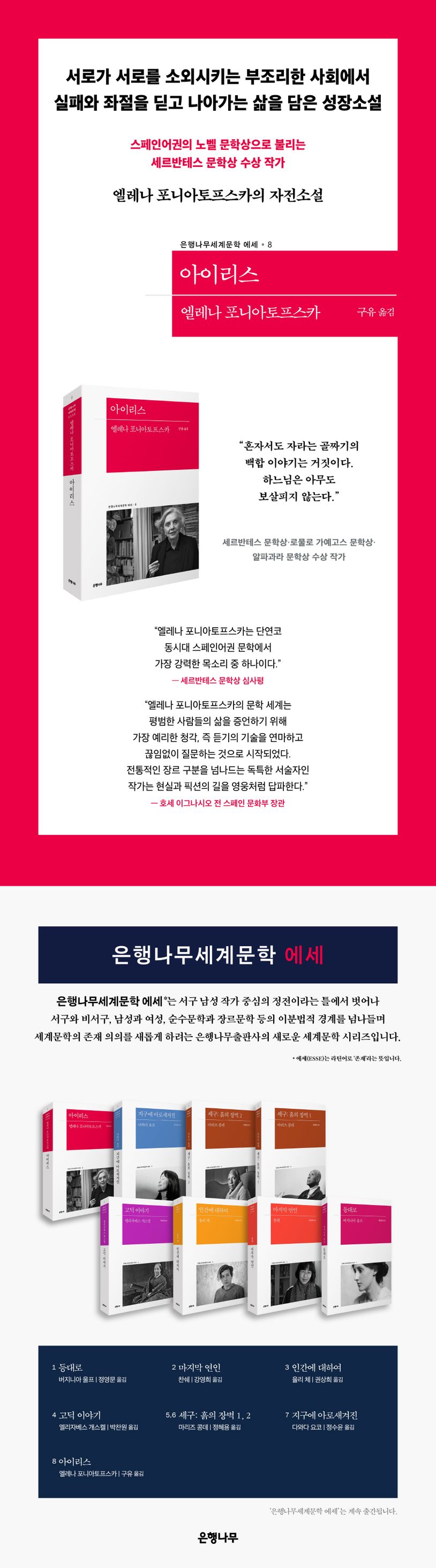 스페인어권 최고 권위의 문학상 세르반테스상을 수상한 현대 멕시코 문학의 거장 엘레나 포니아토프스카의 장편소설 《아이리스》가 은행나무세계문학 에세 제8권으로 출간됐다. 로물로 가예고스 문학상, 알파과라 문학상, 마사틀란 문학상 등 다수의 문학상을 수상한 그는 멕시코를 넘어 스페인어권 전체를 대표하는 여성 작가다. 《아이리스》는 그런 작가의 삶을 녹여낸 자전소설이다.