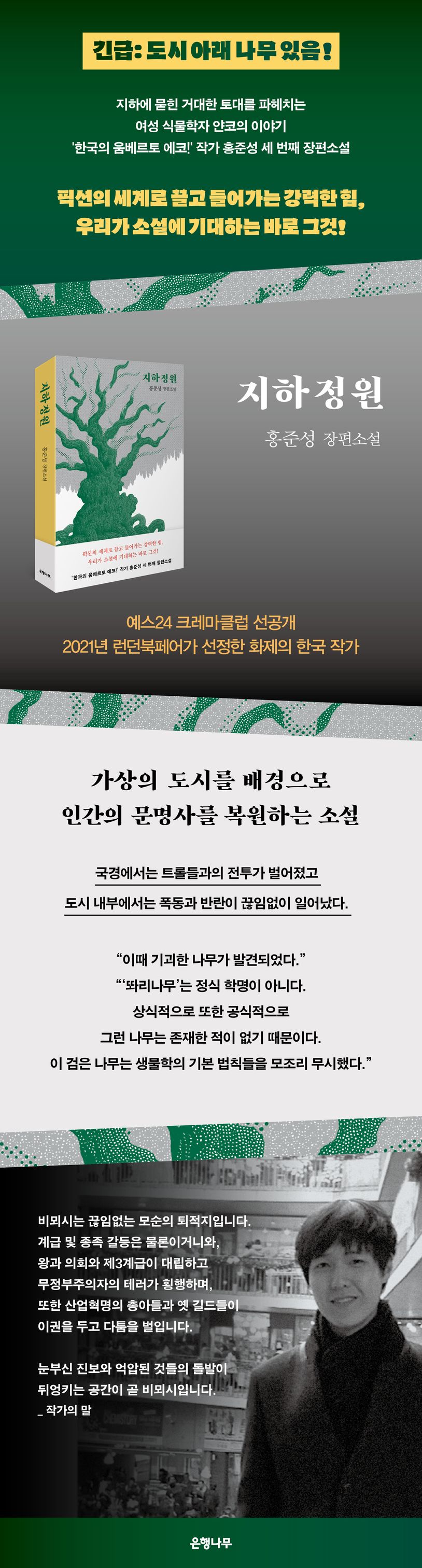 “한국의 움베르토 에코!” 독자들로부터 찬사를 얻은 소설가 홍준성의 세 번째 장편소설 《지하 정원》이 은행나무출판사에서 출간되었다. 예스24 크레마클럽을 통해 먼저 독자를 만난 이 작품은 여성 식물학자 얀코가 비뫼시라는 가상의 도시 지하에 ‘똬리나무’라 명명된 거대한 나무가 있다는 사실을 알게 되고 그에 얽힌 비밀을 파헤쳐나가는 파란만장한 과정을 담은 소설이다. ‘비뫼’라는 가상의 도시를 배경으로 인간의 정신사를 복원해내고자 하는 작가 홍준성은 한국문학에서는 보기 드물게 거대서사에 도전하는 작가다. 전작 《카르마 폴리스》를 통해서 독자들로부터 “한국의 움베르토 에코”, “천명관의 《고래》와도 같은, 이야기의 거센 파도”, “어마어마한 몰입감. 환상적인 문체”, “혼돈과 허무, 역사속의 사회상을 총 집결해놓은 듯”하다는 평을 받은 바 있으며, 2021년 런던북페어에서 화제의 한국 작가로 소개되기도 하였다.