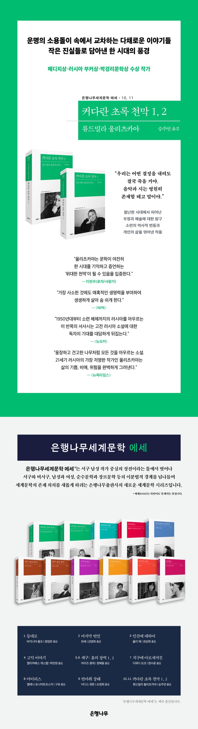 거대한 역사 속 작은 개인들의 삶과 자유를 탐구하며 현대 러시아 문학을 이끌어온 작가 류드밀라 울리츠카야의 《커다란 초록 천막》이 은행나무세계문학 에세 제10·11권으로 출간됐다. 2010년에 발표된 《커다란 초록 천막》은 소련의 정치적 격동과 그 속에서 피어난 예술을 바탕으로 한 시대를 살아간 사람들의 다채로운 삶의 궤적을 다룬다.