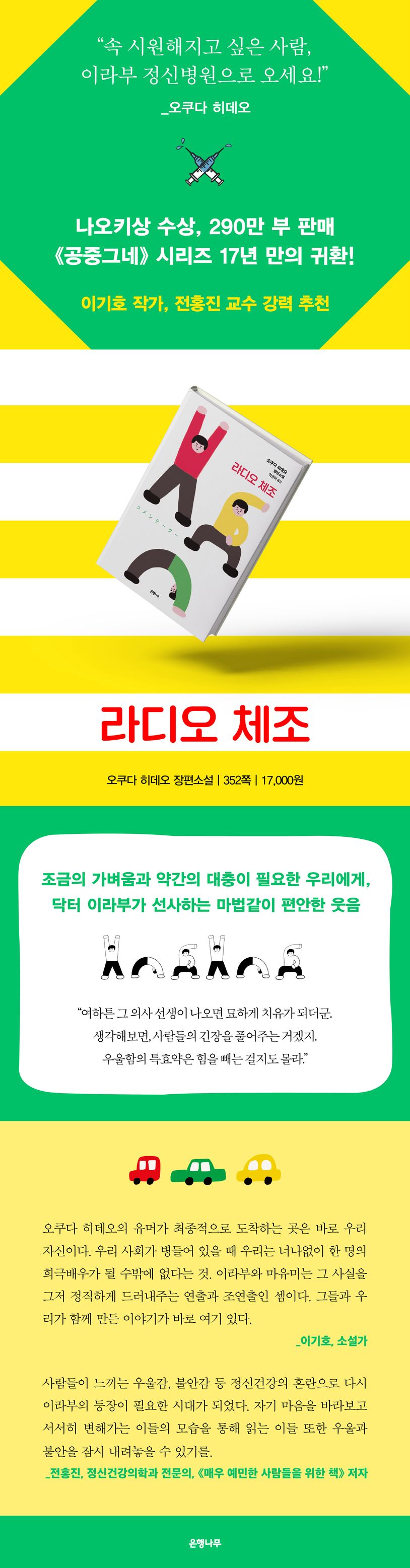 오쿠다 히데오는 팬데믹 이후 계속되는 극심한 혼란과 불안을 마주하며 ‘이라부라면 어떻게 반응할까?’ 하는 궁금증에서 닥터 이라부의 귀환을 결심했다고 밝혔다. 그만큼 초긴장 사회를 살아가는 우리가 공감할 수밖에 없는 여러 심리적 문제들이 담겼다. 화가 나도 화를 내지 못하는 세일즈맨, 착실해서 탈이 나고 만 피아니스트, 새로운 환경에서 자기 자신처럼 살아가지 못하는 대학생…. 마음의 병을 앓는 이들이 황당하고 기발한 치료법을 따라 서서히 치유되는 과정을 좇으며, 우리는 스스로의 문제를 마주하고 또한 달랠 기회를 얻을 수 있다. 닥터 이라부는 입버릇처럼 말한다. “괜찮아, 괜찮아. 적당히 해도 돼.” 우리의 숨통을 트이게 하고 느슨하게 풀어주는 반가운 책이다.