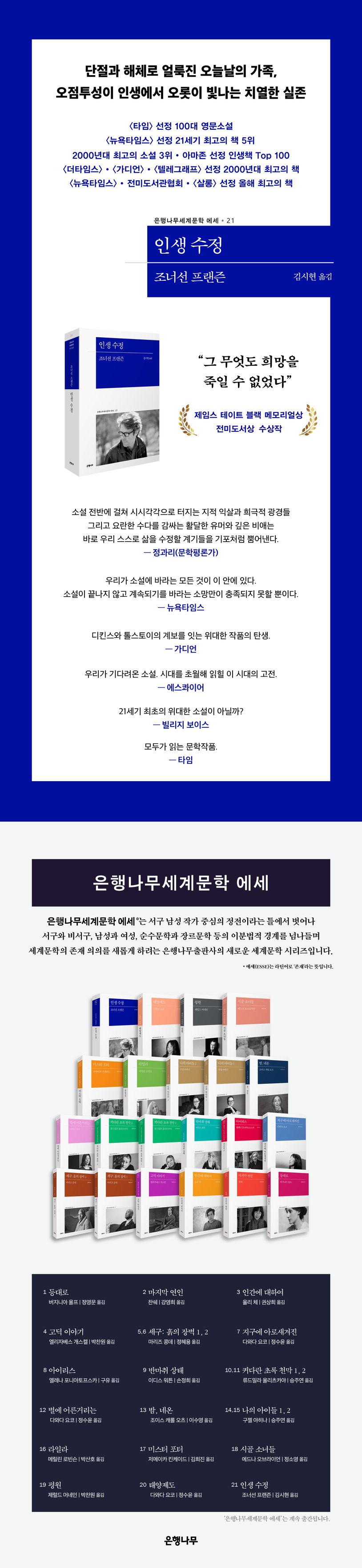 스콧피츠제럴드의《위대한개츠비》,존스타인벡의《분노의포도》등의걸작과함께〈타임〉선정100대영문소설목록에당당하게이름을올린조너선프랜즌의《인생수정》은이미수많은비평가에의해고전의반열에올라선,우리시대의모던클래식으로자리매김했다.